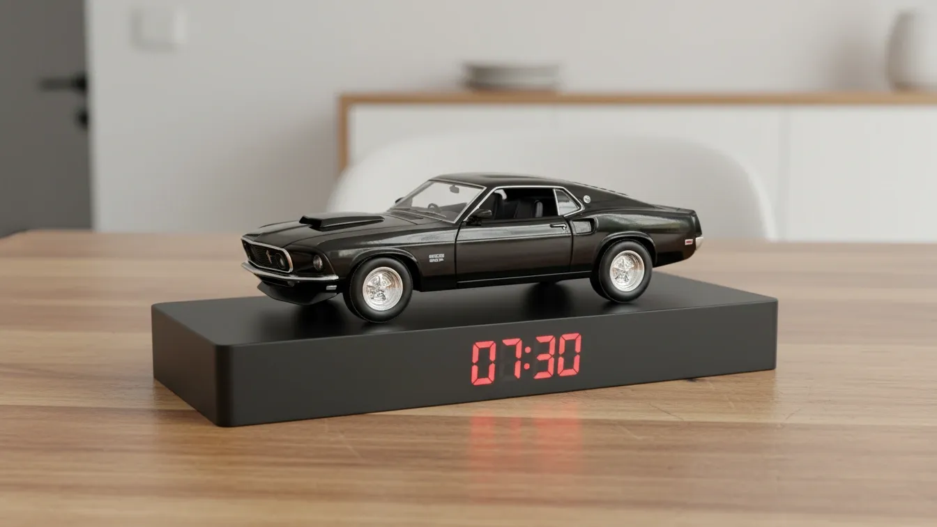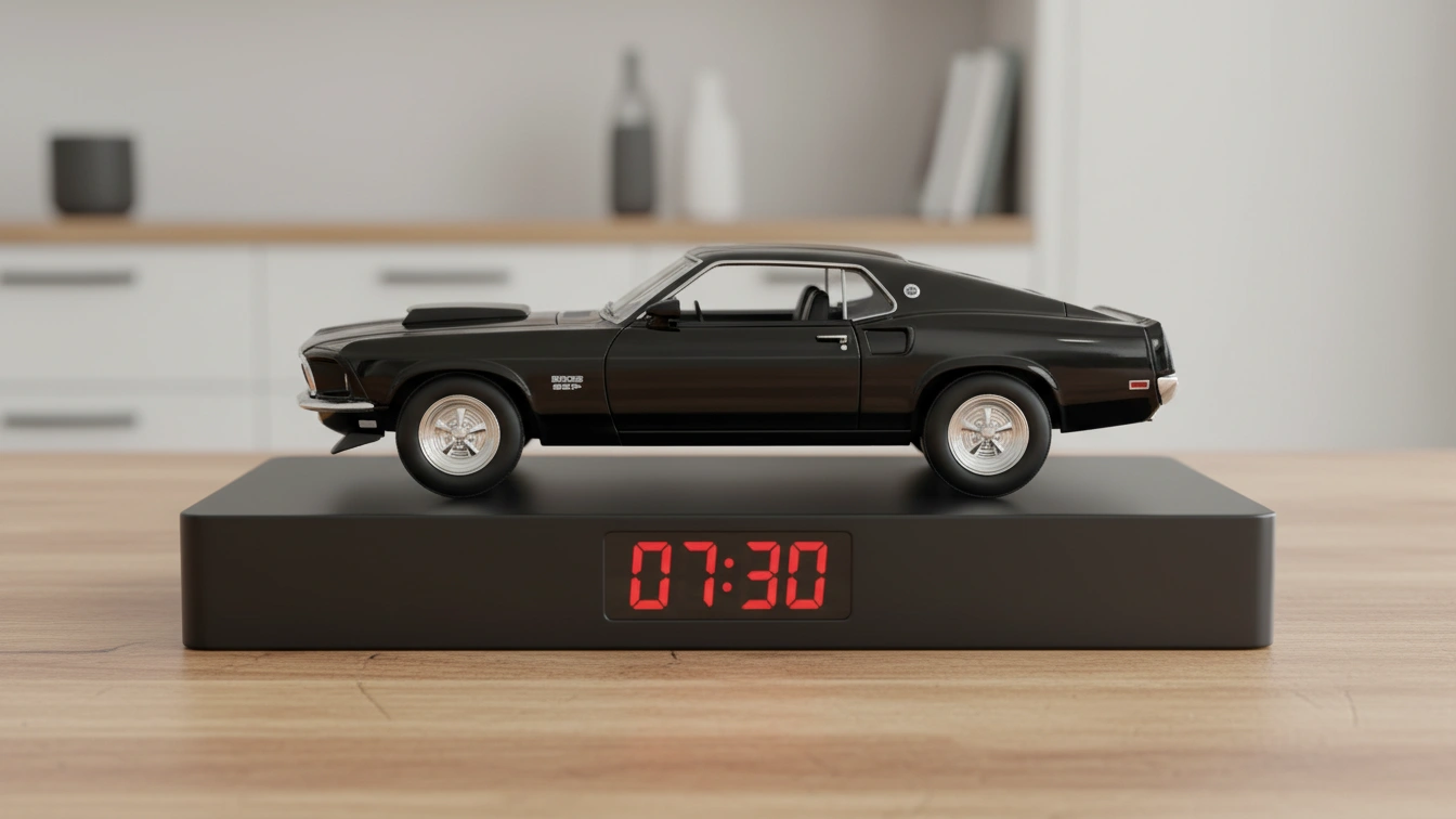 This model car alarm clock is built using a 1:24 scale 1969 Ford Mustang collectible model, mounted on a minimalist black platform with an integrated red digital time display. It combines legendary muscle car styling with modern alarm clock functionality, making it both a collectible display piece and a practical everyday clock.
