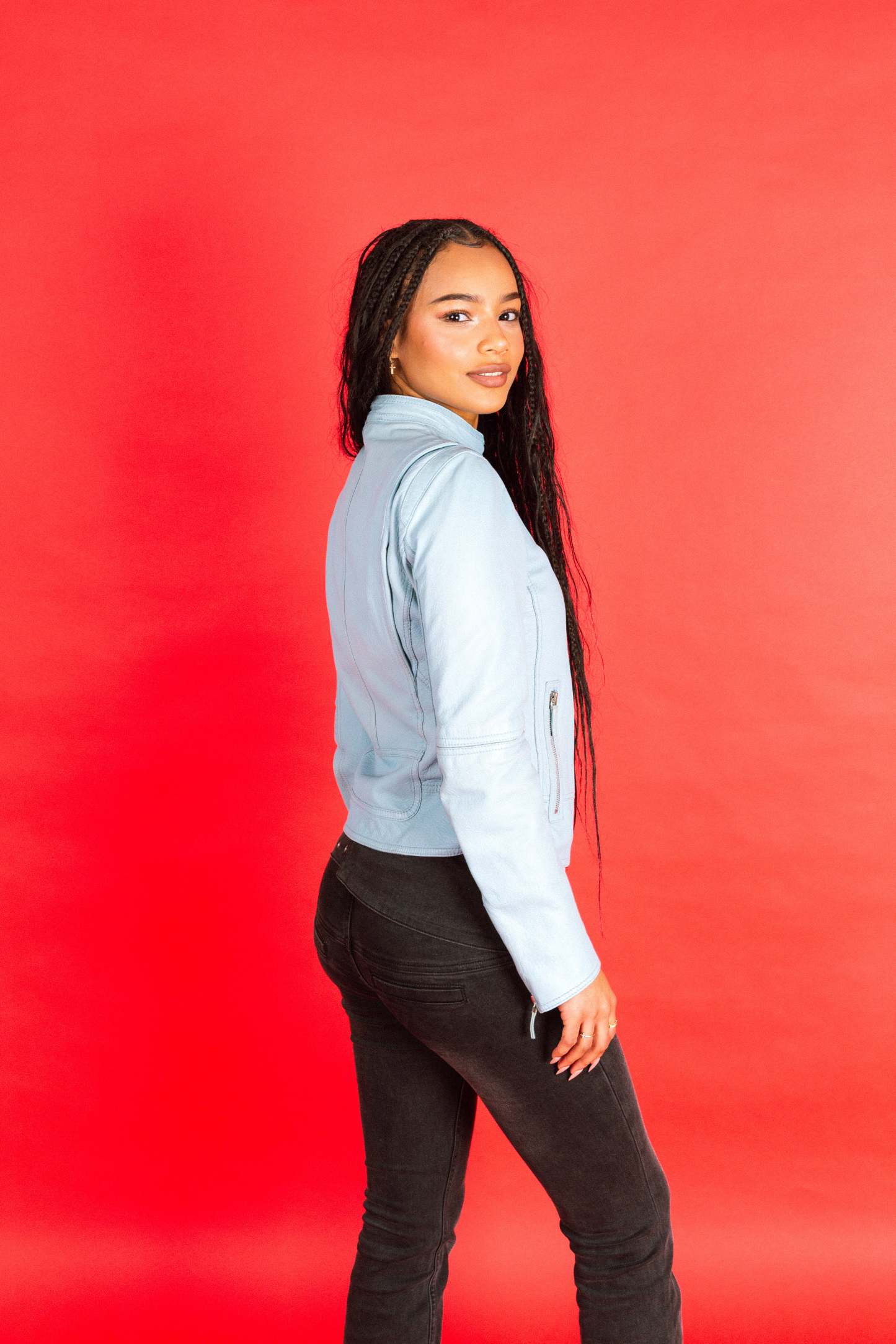 A rare and striking archive piece from 1970s Gucci, this Baby Blue Asymmetrical Leather Jacket reflects the house’s experimental approach to colour, cut, and luxury outerwear during the era. Crafted from smooth leather in a soft yet eye-catching baby blue tone, the jacket stands out as an expressive alternative to traditional leather silhouettes.