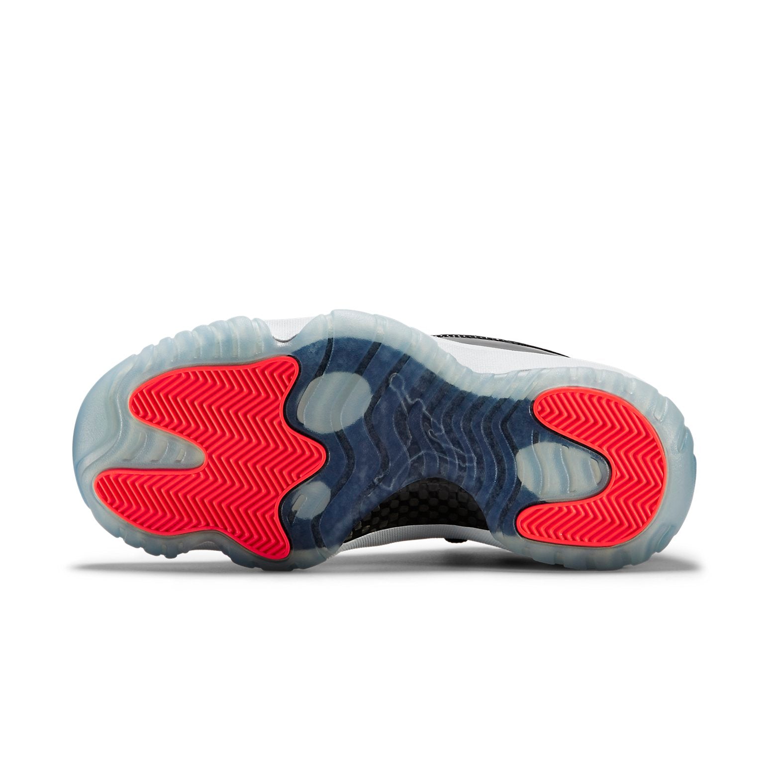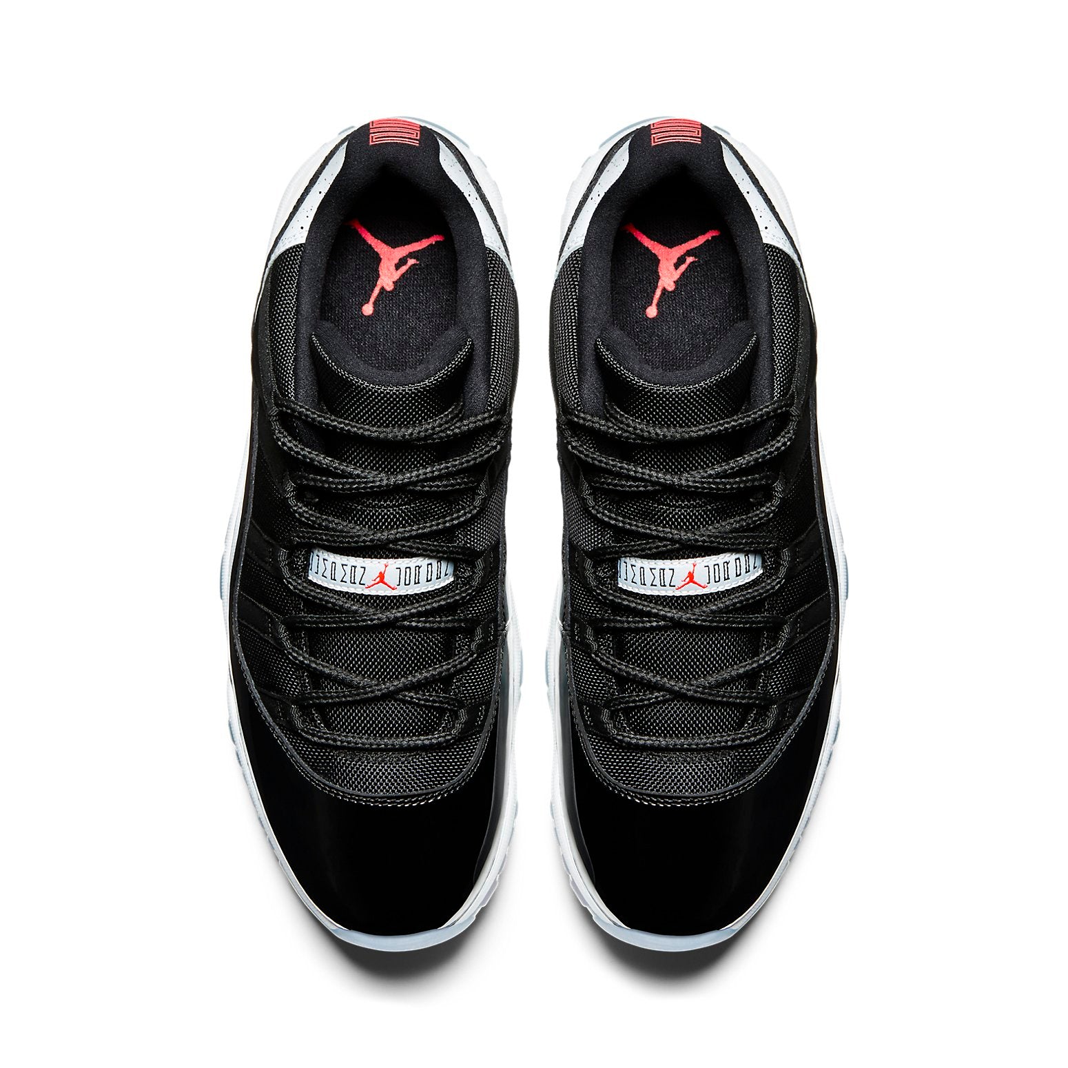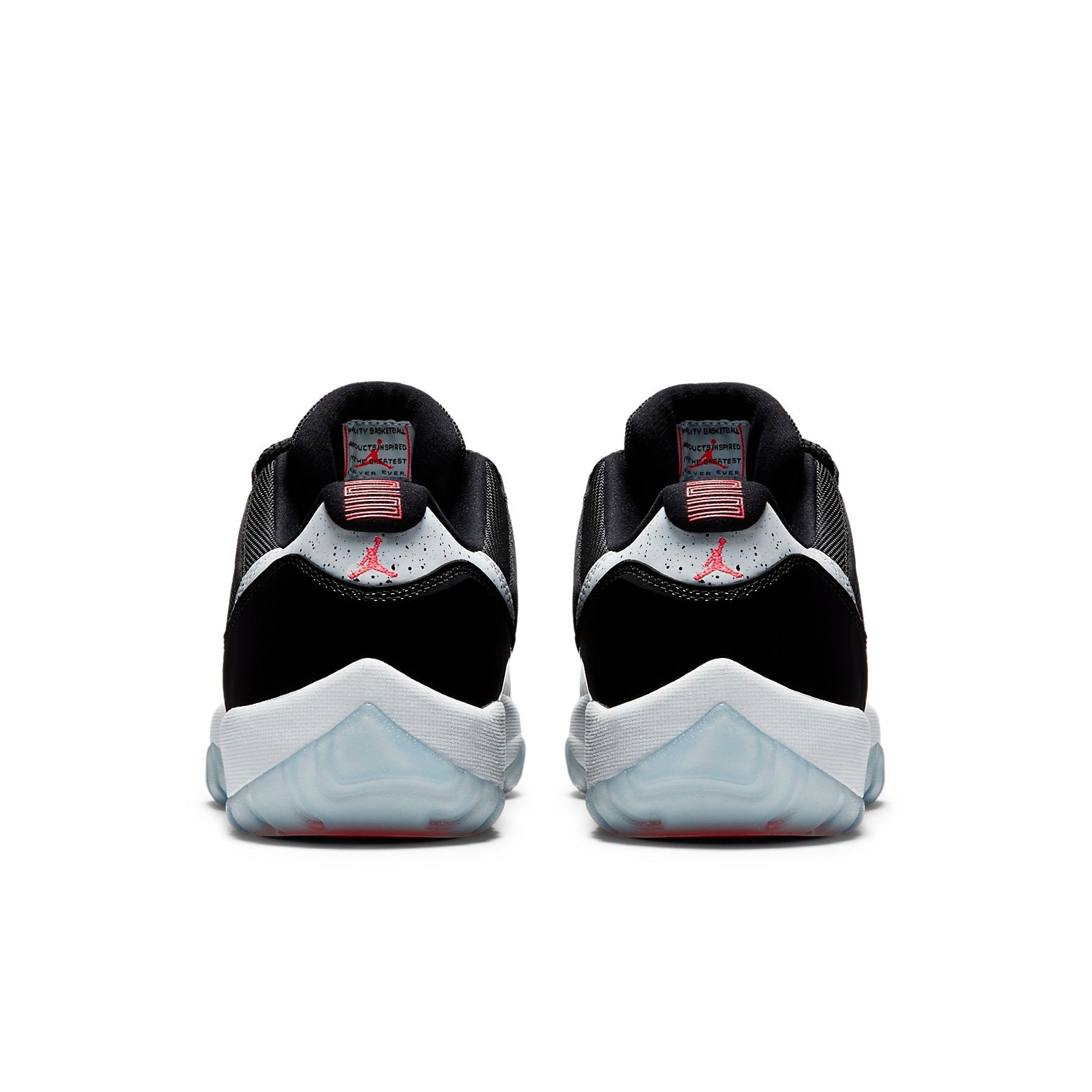The Air Jordan 11 Retro Low "Infrared 23" sports vibrant accents on a largely neutral look. The shoe"s low-top upper appears with a black mesh base, overlaid by black patent leather on the mudguard. Speckled detailing accents the leather heel overlay, while the heel, as well as the tongue, highlight the design in Infrared 23. Underfoot, a contrasting white phylon midsole provides cushioning, giving way to a translucent rubber outsole that incorporates herringbone pods for traction.