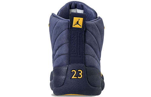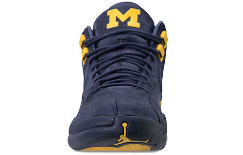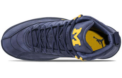 The Air Jordan 12 Retro is a sneaker that was originally released as an exclusive for the University of Michigan. It's now available to the general public, and it's a great sneaker for anyone who wants to show their support for the Wolverines. The shoe is navy blue with Amarillo accents on the midsole shank, upper eyelets, and 23 brandings. The Michigan logo appears on the tongue, and the sneaker has a molded suede upper. It's a great shoe for showing your team spirit, and it's also very comfortable and stylish.