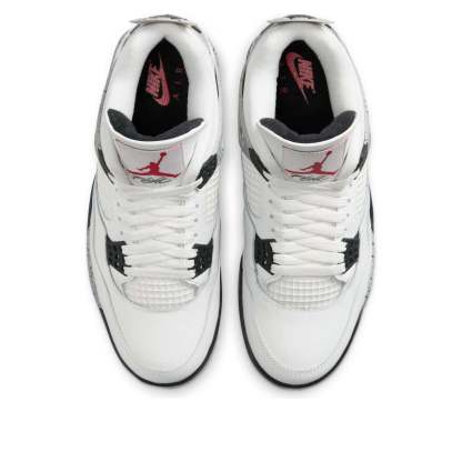The iconic Air Jordan 4 "White Cement," a 1989 OG, returns in 2025. This highly anticipated release features a crisp white leather upper, grey speckled midsole, and signature black accents. Boasting original Nike Air branding and visible Air cushioning, it's a must-have for collectors and sneakerheads alike.