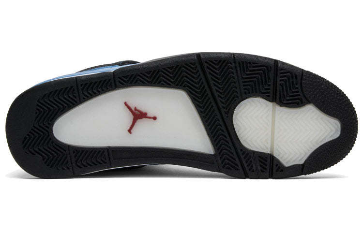 The Travis Scott x Air Jordan 4 Retro 'Cactus Jack' colorway is a tribute to the city of Houston's bygone football team. The shoes are made of Durabuck leather and have a University Blue colorway with a Varsity Red insole. The black lace cage and a heel panel feature a light blue speckle pattern. Cactus Jack branding appears on the left heel in Varsity Red, with a matching Jumpman logo on the right. These shoes are perfect for showing your support for your favorite team, or just for rocking a cool, unique style.