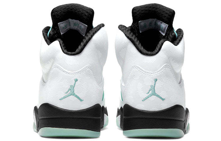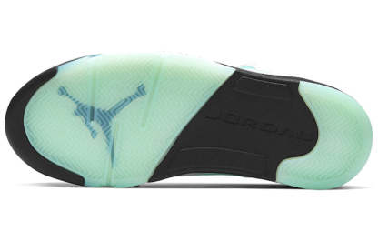 The Nike Air Jordan 5 Retro model gets a chilly "Island Green" makeover. The leopard print upper comes in white, while the mesh, tongue and eyestay are in Island Green. Black laces and detailing tie the upper together, underneath is a black midsole with shark teeth detailing and a semi-translucent coat in Island Green.