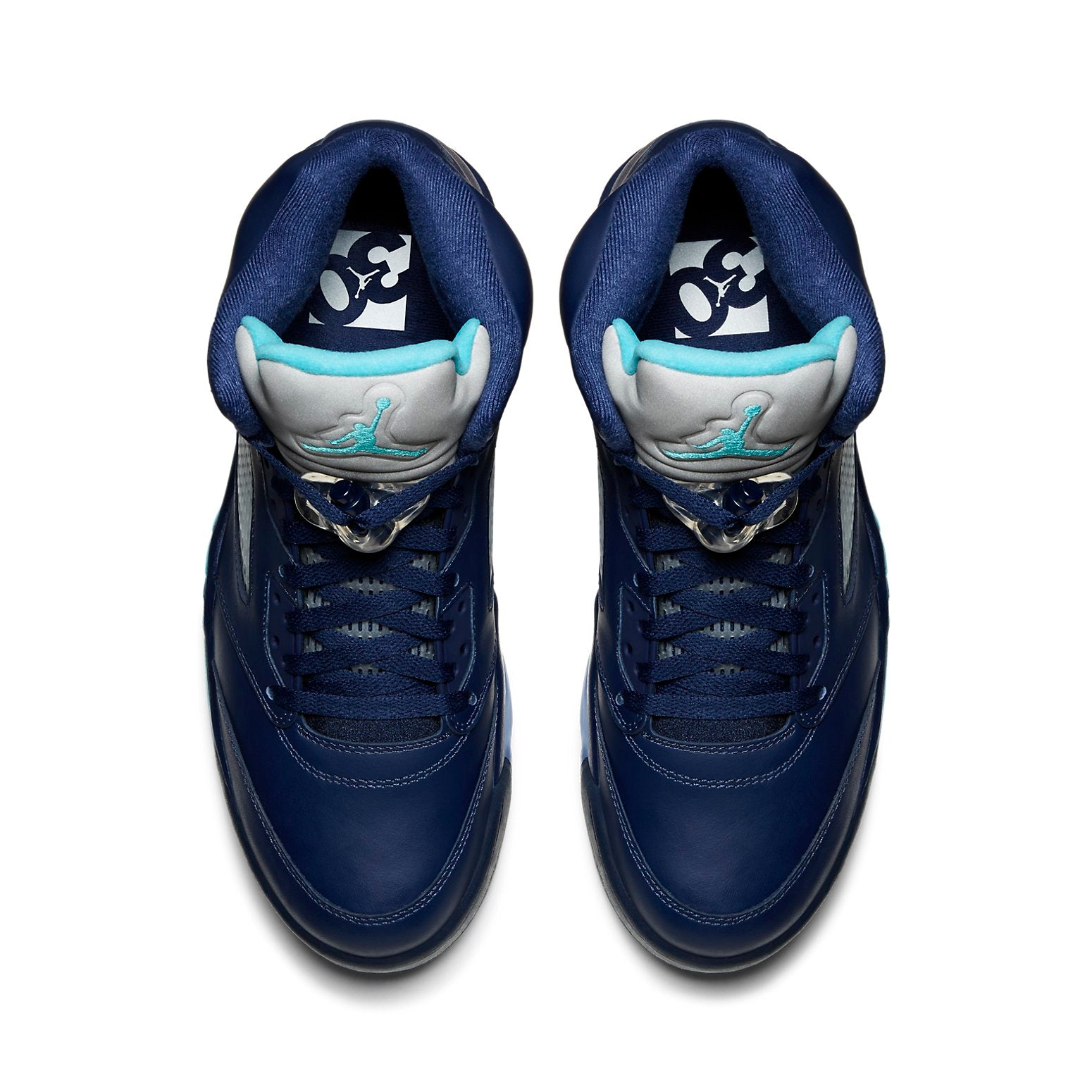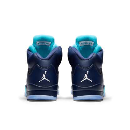 Introducing the Nike Air Jordan 5 'Pre-Grape'! This special sneaker is inspired by a 1990 Tinker Hatfield sample that was intended to be released instead of the iconic 'Grape' colorway. The sneaker features a Midnight Navy leather upper, grey and turquoise accents, and a 3M reflective tongue. Released in May 2015, the design also includes turquoise shark teeth and an icy blue translucent outsole. Whether you're a casual sneakerhead or a hardcore collector, this shoe is a must-have for your collection!