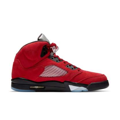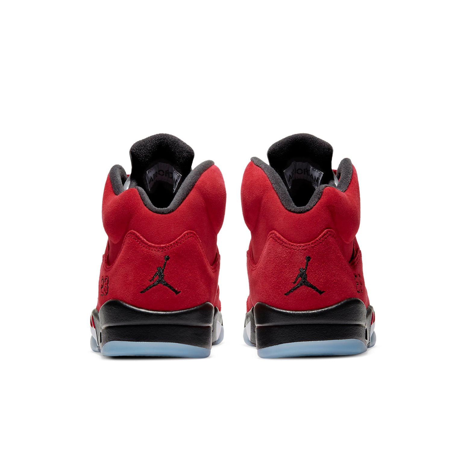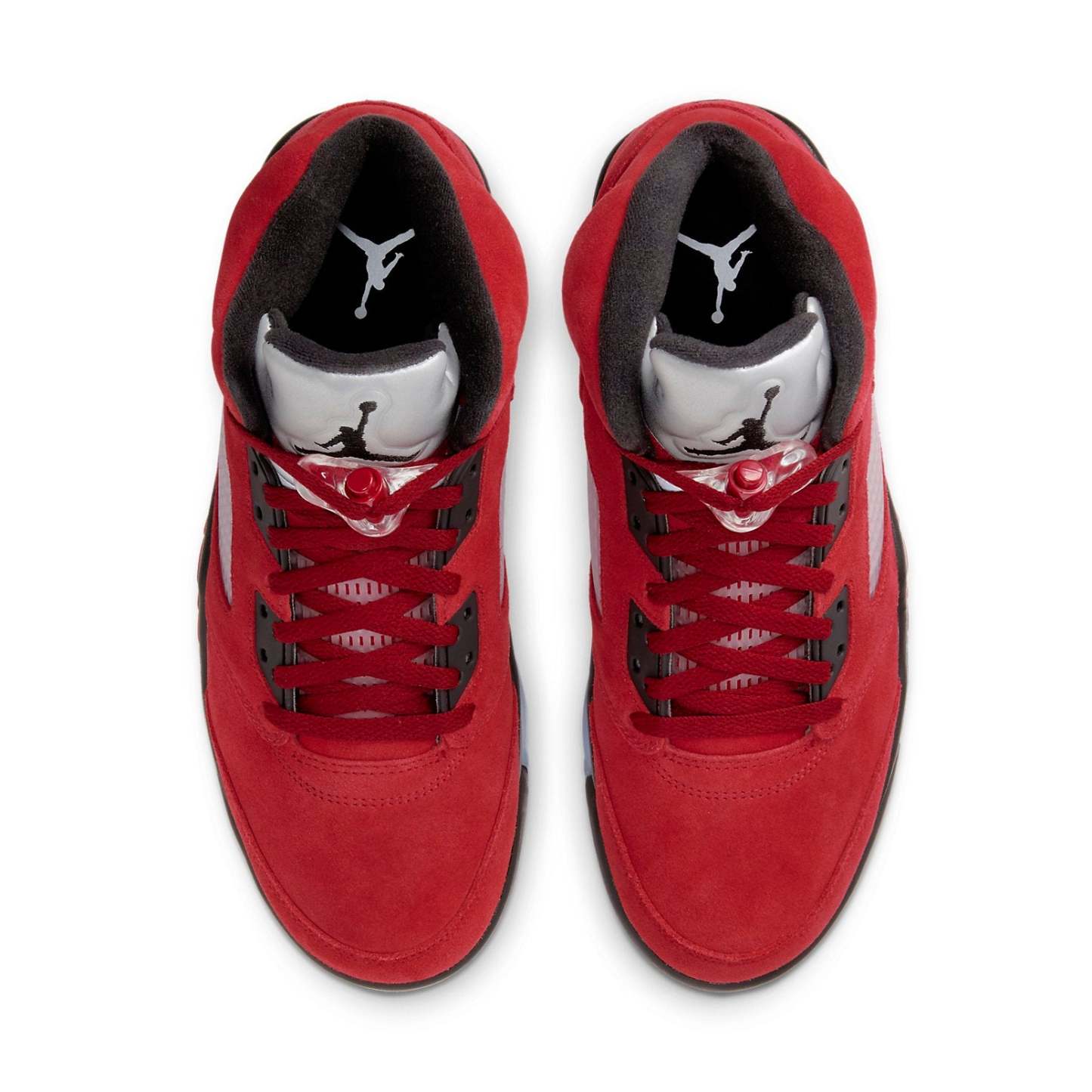 This Nike Air Jordan 5 Retro "Raging Bull" features a plush Varsity Red suede upper, equipped with black eyelets and a Jumpman-branded reflective silver tongue. The black midsoles and insignia dress atop, icy blue soles hit the underside of the tooling, and the signature “23” stamps near the heel complete the design. SKU: DD0587-600 Release Date:March 04, 2021 Color: WHITE/TECH GREY/BLACK/FIRE RED
