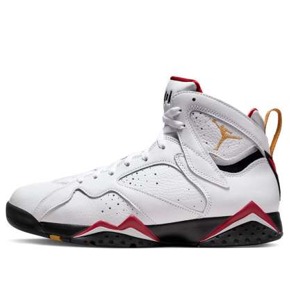 The Air Jordan 7 Retro 'Cardinal' 2022 is a stylish sneaker for adults. It features a white leather upper with perforations and accents in cardinal red and black. The design is complete with a golden Jumpman logo and heel tab. The inspiration behind the design is the traditional bishop's robes, with the cardinal red and chutney colors representing the colors of the robes. The rubber sole provides comfort and durability, making it perfect for everyday use. This sneaker is a must-have for any Air Jordan fan.