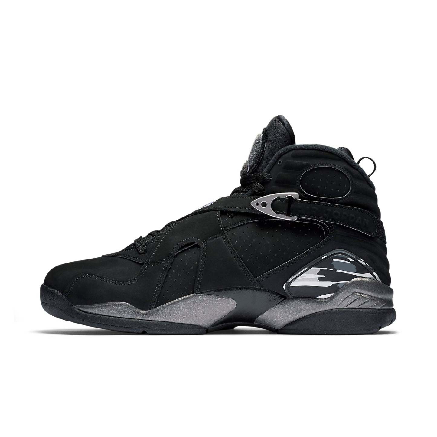 The Air Jordan 8 Retro 'Chrome' colorway is back and better than ever! First released in 2003, this colorway is best known for its on-court appearance by Kobe Bryant during the 2003 NBA playoffs. The 'Chrome' colorway features an all-black upper in smooth and perforated nubuck, with chrome detailing on the buckle of the strap. The Air Jordan 8 Retro 'Chrome' is a must-have for any Jordan fan, and would make an excellent addition to your collection.
