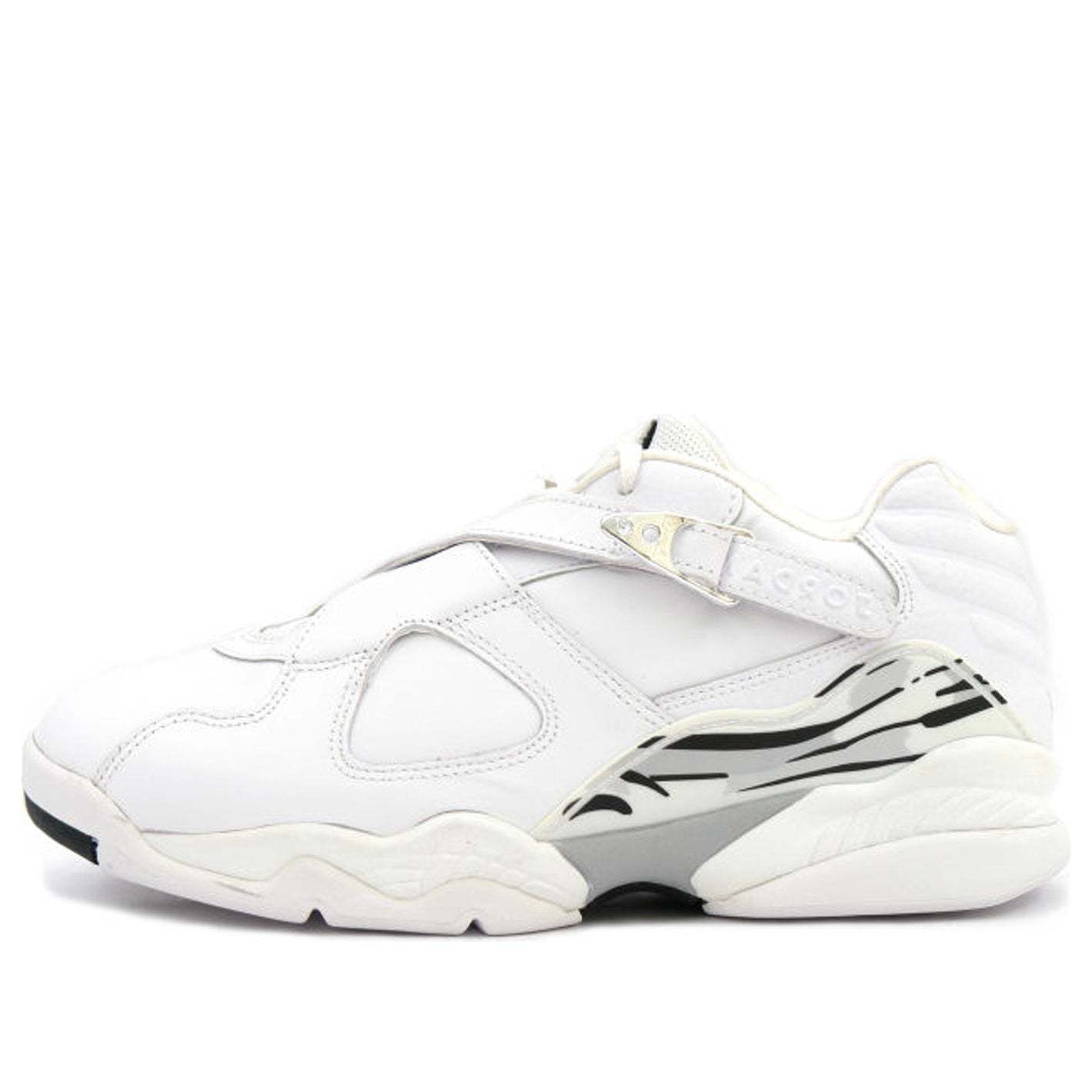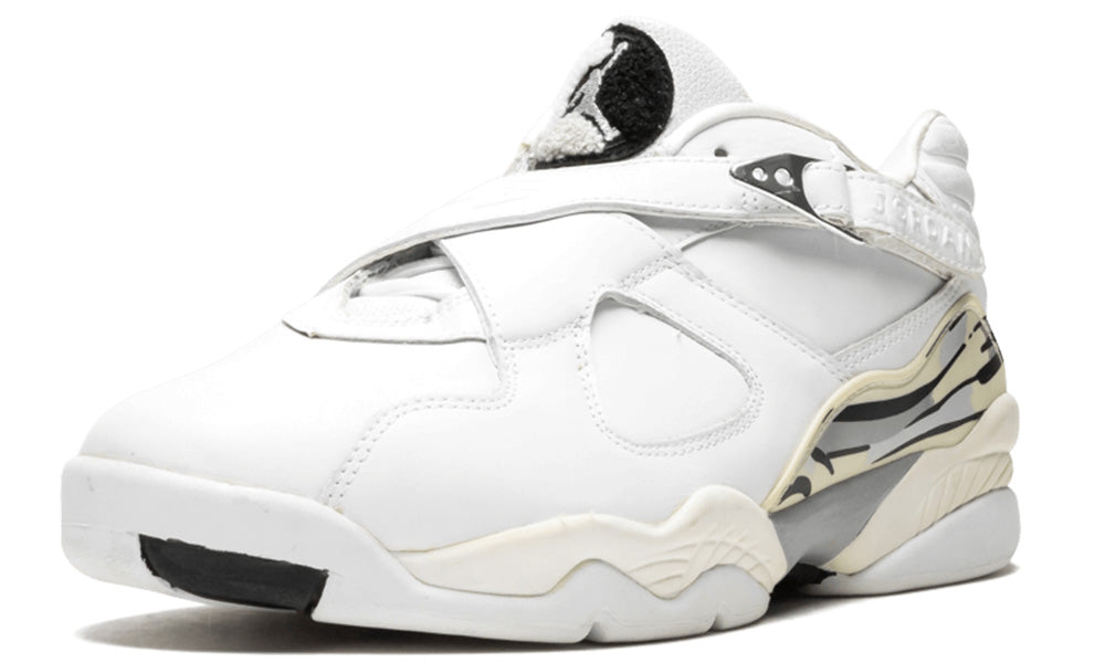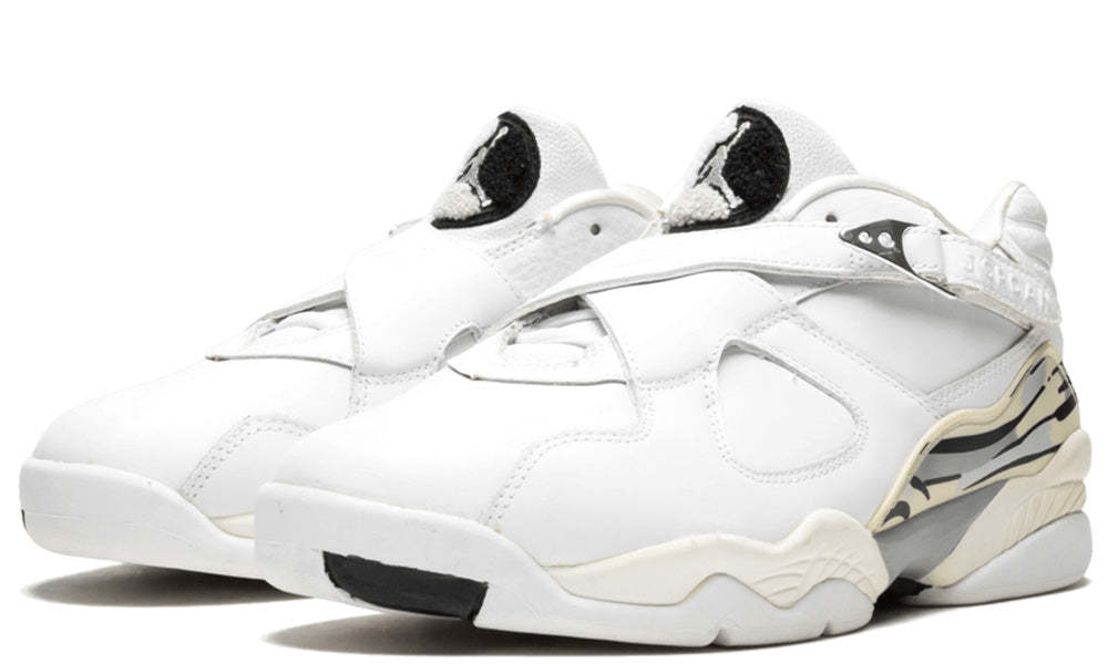 In 2003, Jordan Brand brought the Air Jordan 8 back as a low-top sneaker and it quickly became a must-have among fans of the brand. The Air Jordan 8 Retro Low 'White Metallic Silver' is an OG colorway that features a white leather upper with a chrome cross-strap buckle, a chenille Jumpman tongue patch, and a mid-foot panel with a white, black and silver streak graphic. The sneaker also comes with a white outsole that includes a streak graphic and metallic silver Jumpman branding. If you're looking for a clean and classic sneaker to add to your collection, then this is the one for you.