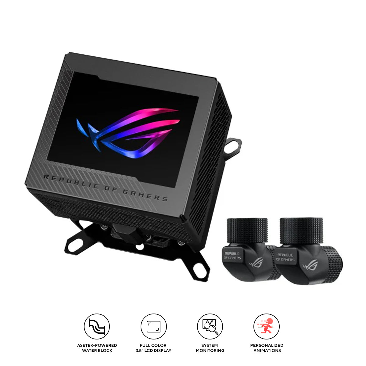 The ROG Ryujin III WB seamlessly merges cutting-edge cooling technologies with eye-catching customizable aesthetics. It boasts an Asetek-powered water block featuring 178 micro-cooling fins and a copper alloy cold plate for exceptional thermal efficiency, helping push the performance envelope of the latest Intel® and AMD CPUs. The embedded fan enhances airflow to the motherboard VRM, while a 3.5-inch LCD offers limitless customization options, allowing you to display hardware information or personalized GIF animations. The Ryujin III WB’s open-loop water-cooling design enables you to create a unique build that perfectly reflects your style.