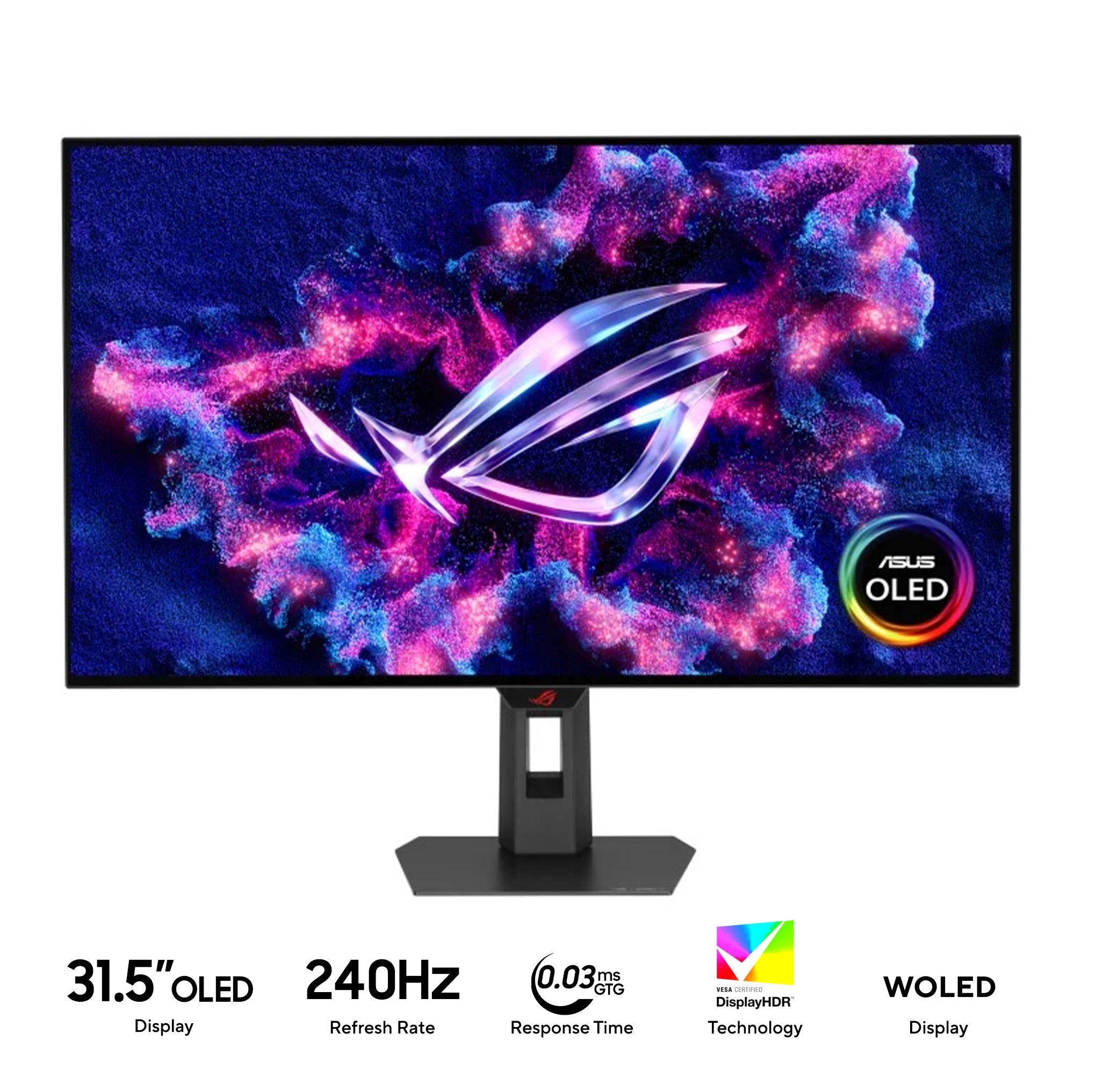 ROG Strix OLED XG32UCWMG gaming monitor ―32-inch (31.5-inch viewable) 4K TrueBlack Glossy™ OLED, dual mode (4K@240Hz, FHD@480Hz), 0.03ms (GTG), G-SYNC® compatible, custom heatsink, OLED Care Pro, Neo Proximity Sensor, VESA DisplayHDR™ 400 True Black, Auto KVM, USB Type-C®
