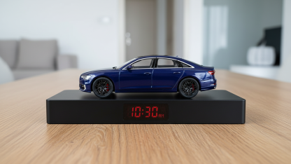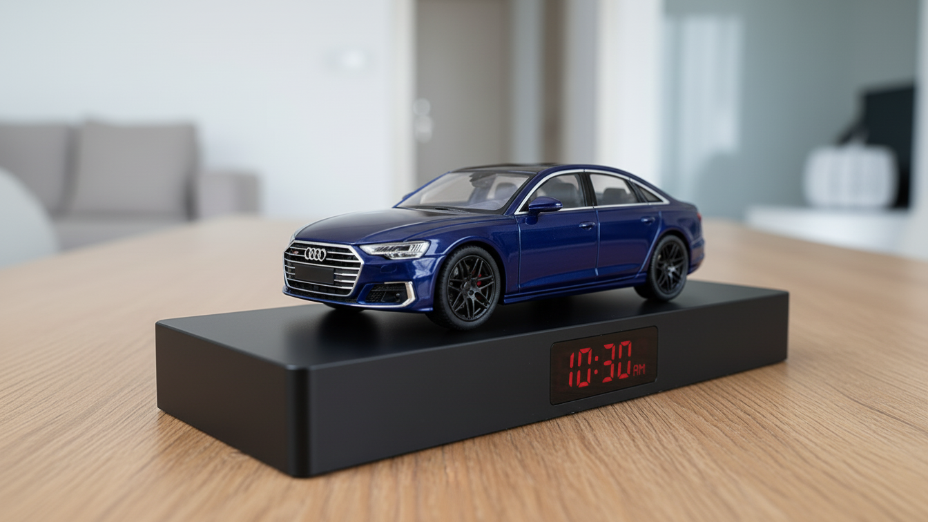 The Audi A6 alarm clock is a handmade desk clock created for fans of Audi’s refined luxury and performance. Built using a real 1:24 scale Audi A6 collectible model, this alarm clock blends elegant sedan design with everyday functionality.