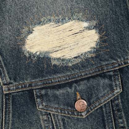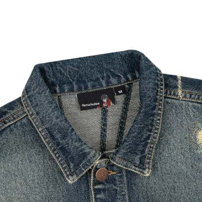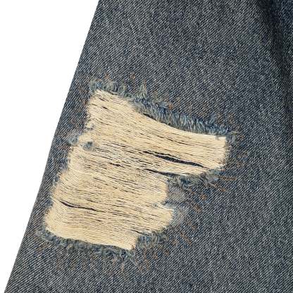 14,5oz denim / 100% cotton / woven design on back / distressed all over with backing patches underneath (not see-through) / true to size