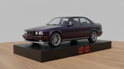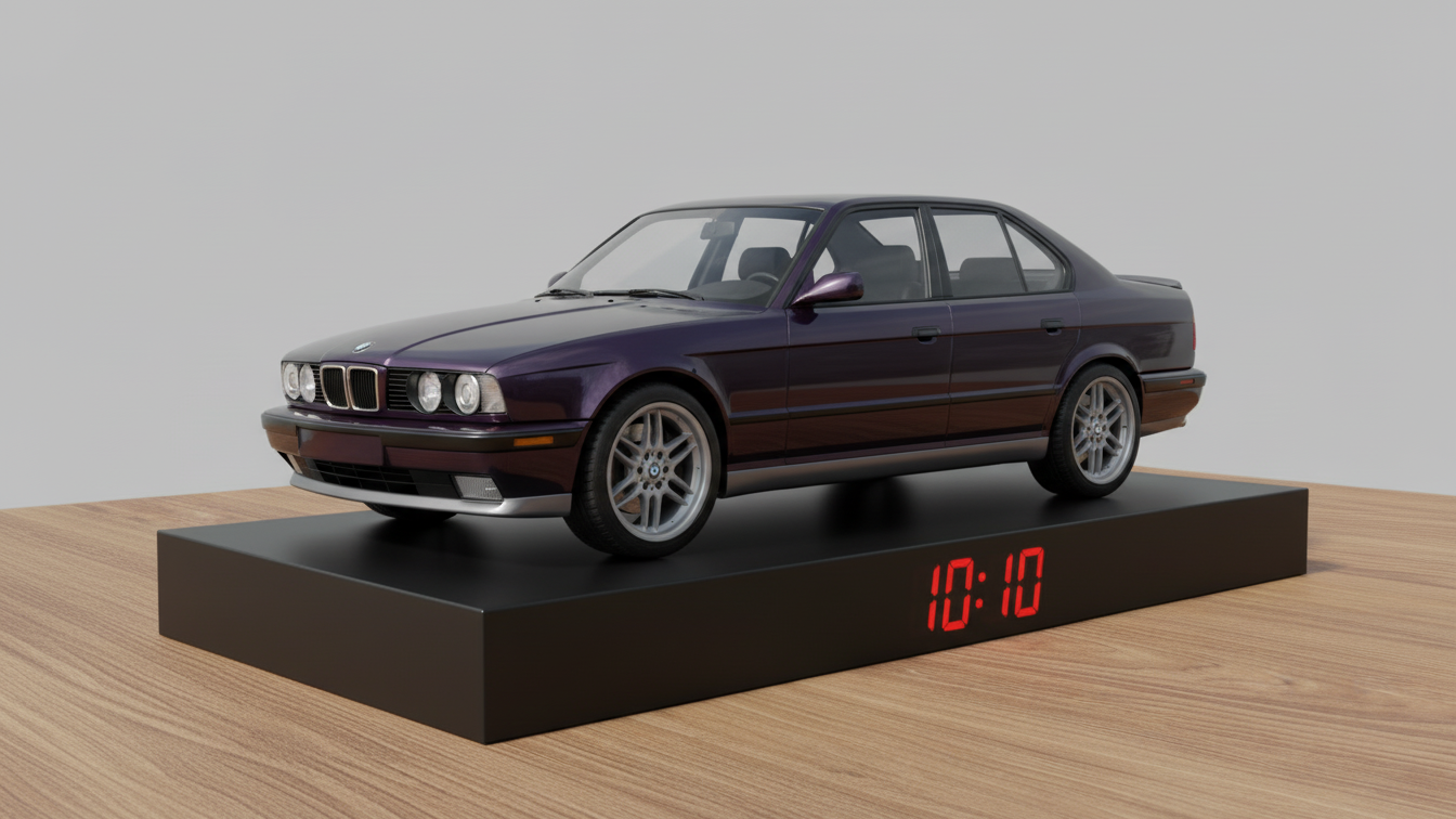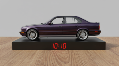 This is a custom-made BMW E34 alarm clock created using a 1:18 scale model car, mounted on a custom black platform with a red digital alarm clock display.