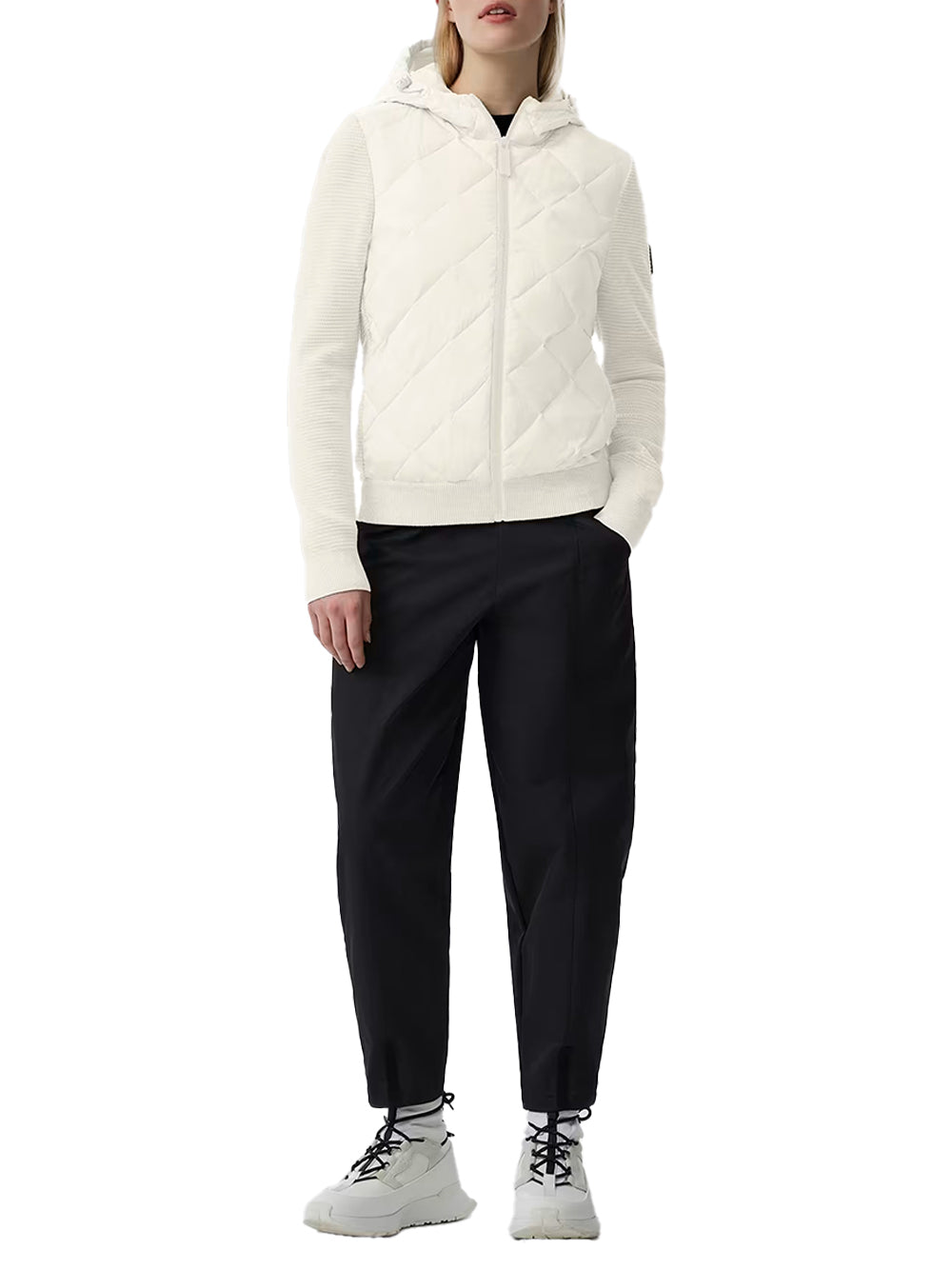The HyBridge Quilted Knit Hoodie in Cottongrass is a technical and cosy , combining quilted down panels with merino-knit comfort. This -inspired and -style layer has an adjustable down hood and rib-knit cuffs to lock in warmth. Two zip pockets and soft-knit side panels make this travel-ready for UK commuters.