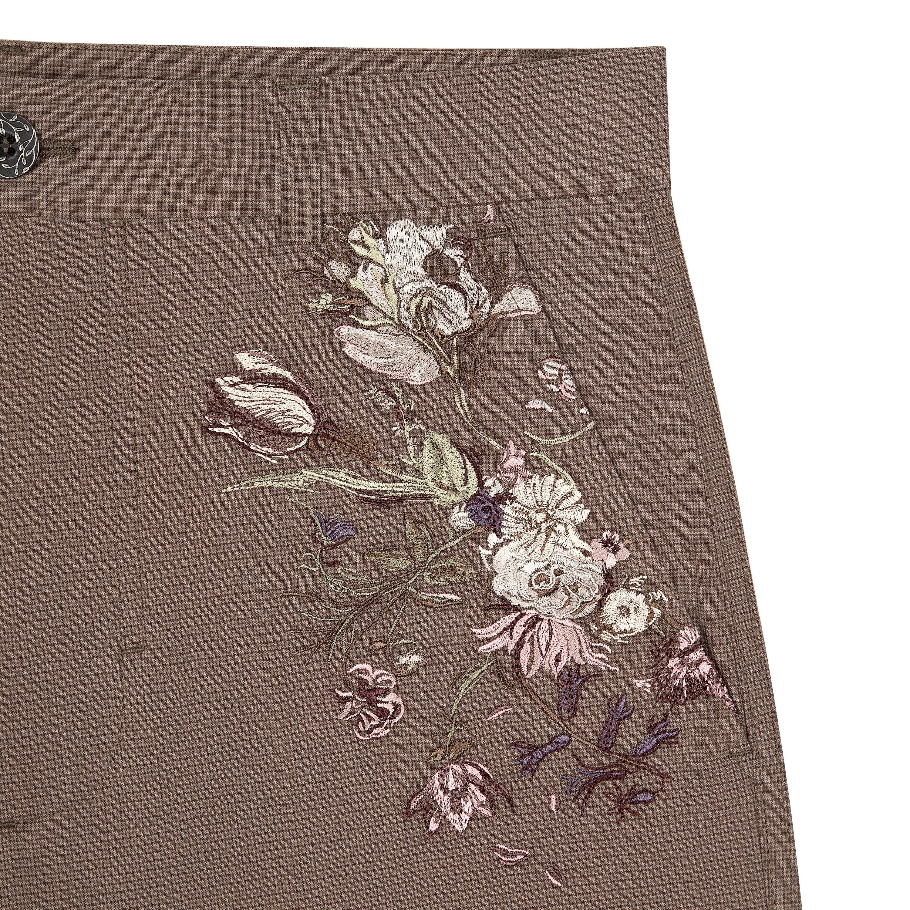 190 gsm plaid patterned gabardine / 73% cotton 25% polyester 2% lycra / embroidery on front / custom buttons / straight fit / fits true to size