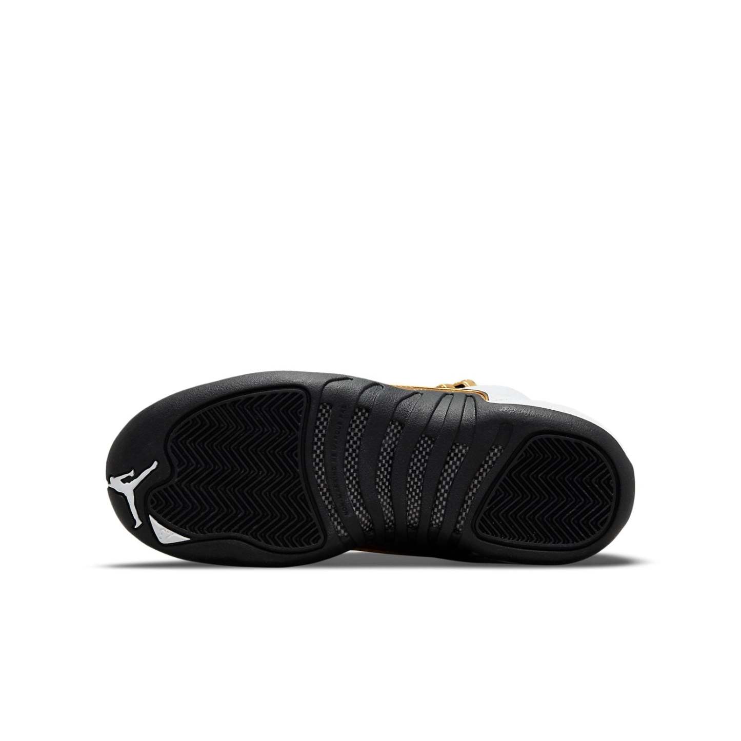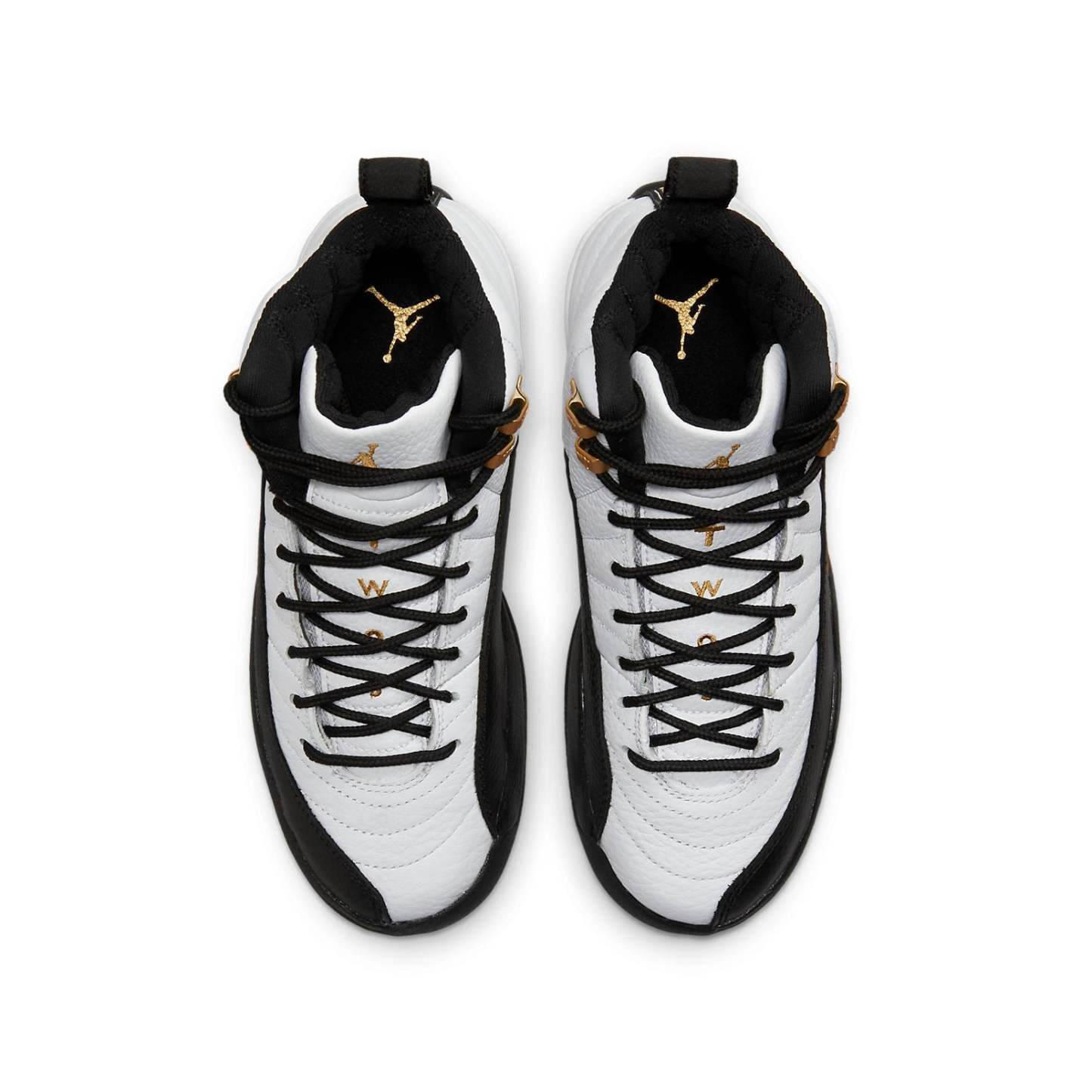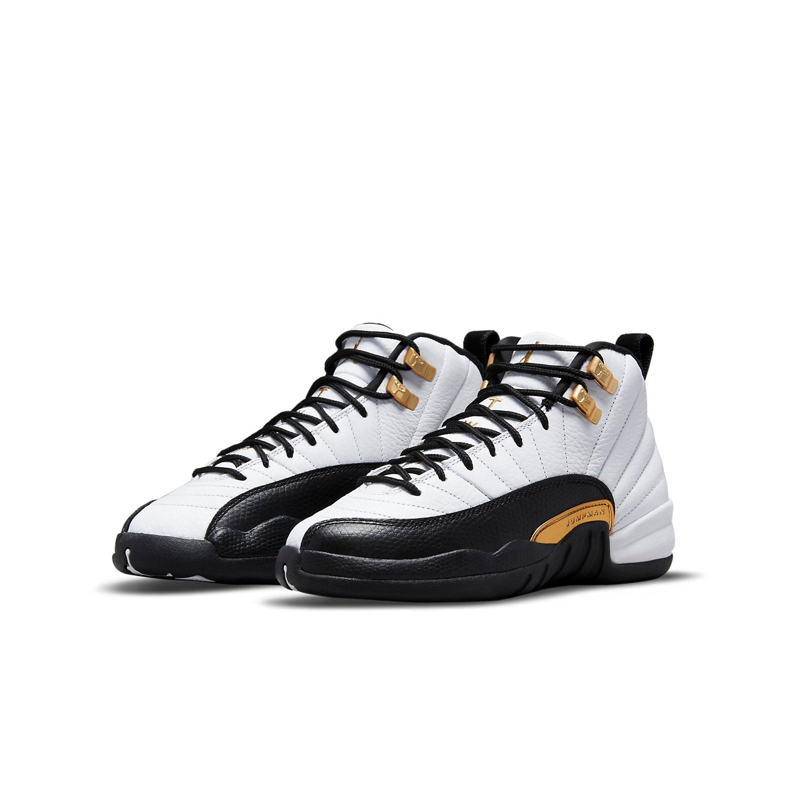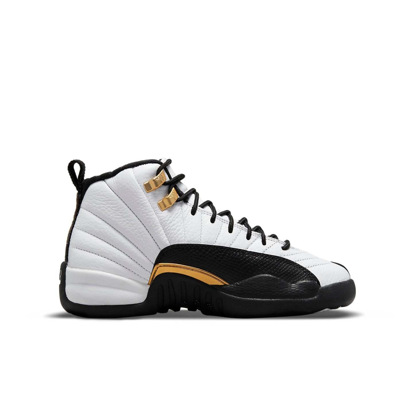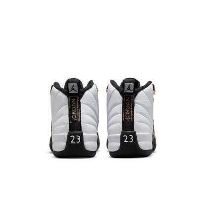 The Air Jordan 12 Retro GS ‘Royalty’ is a premium take on the original ‘Taxi’ colorway from 1996. Like the OG, this version features a stitched white leather upper with black lizard-textured mudguards and metallic gold eyelets. Gilded accents are added to the embroidered Jumpman logo atop the tongue and a small overlay on the lateral side with debossed ‘Jumpman’ lettering. Performance benefits include a Phylon midsole, a full-length Zoom Air unit and carbon fiber shank plate.