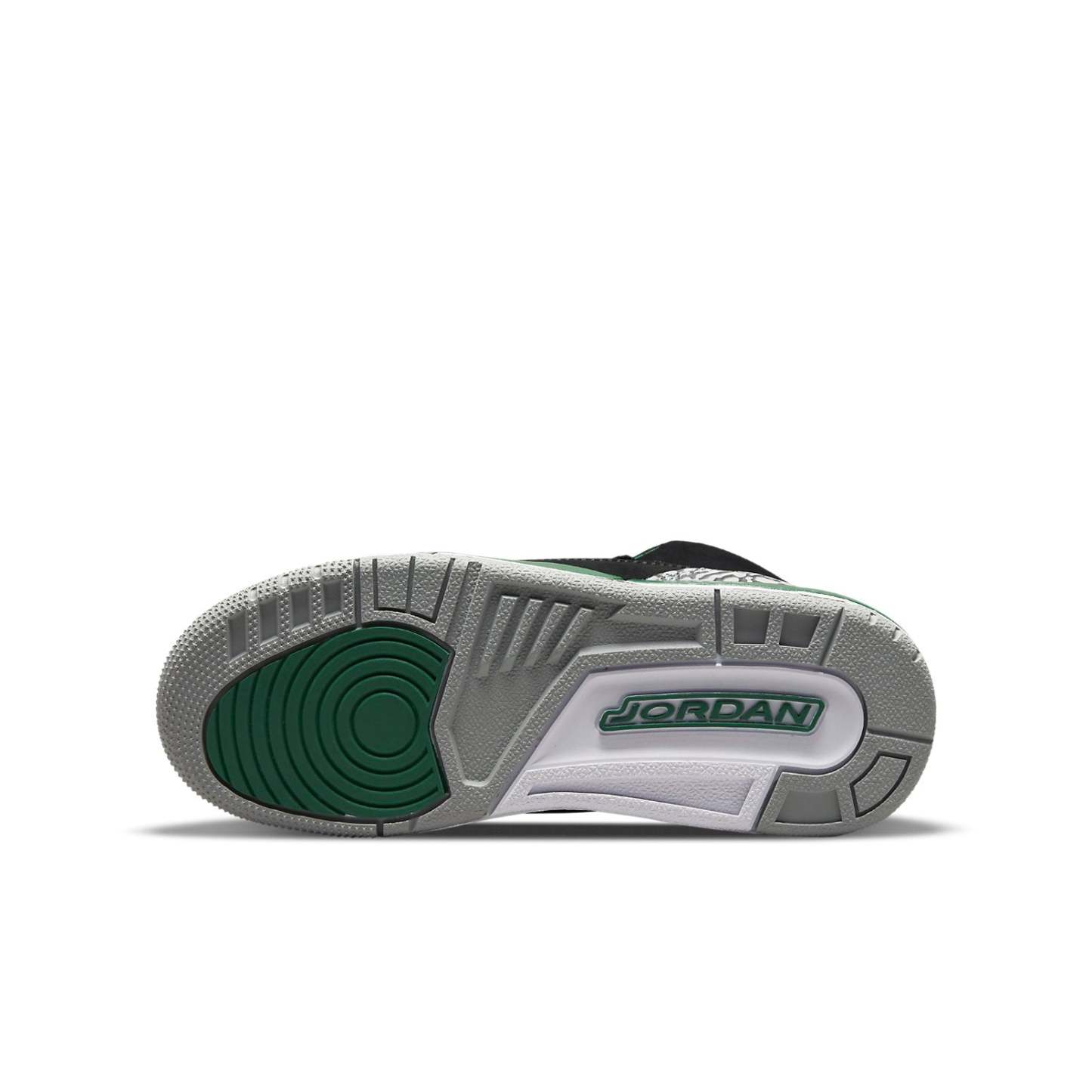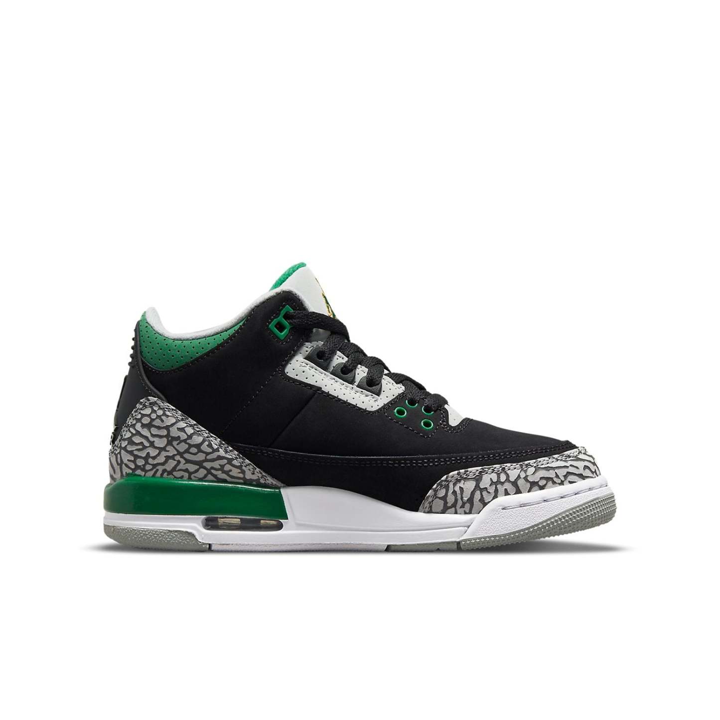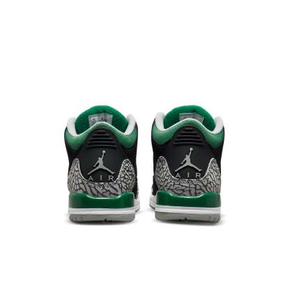 The Air Jordan 3 Retro GS 'Pine Green' is a must-have sneaker for any Jordan fan. Offered in big kids sizing, this sneaker features a black nubuck upper with signature elephant-print overlays at the forefoot and heel. Lush green accents settle on the eyelets, perforated leather collar, and embroidered Jumpman branding atop the tongue. A secondary Jumpman logo decorates the sneaker's back heel. The mid-top is mounted on a two-tone polyurethane midsole, fitted with visible Air-sole cushioning in the heel and reinforced by a durable rubber outsole. Don't miss your chance to add this retro sneaker to your collection.