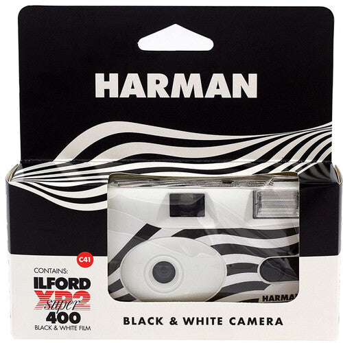 Single use, black & white camera with 27 exposures of XP2 SUPER film and a built-in flash. It can be processed on the high street (in C41 chemistry).