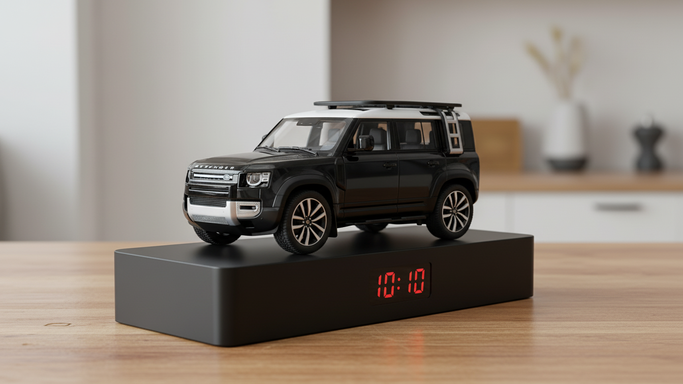 Handmade using a detailed Defender model, this alarm clock is designed for Land Rover enthusiasts who appreciate bold design and unique automotive decor. Perfect for desks, shelves or bedside tables.