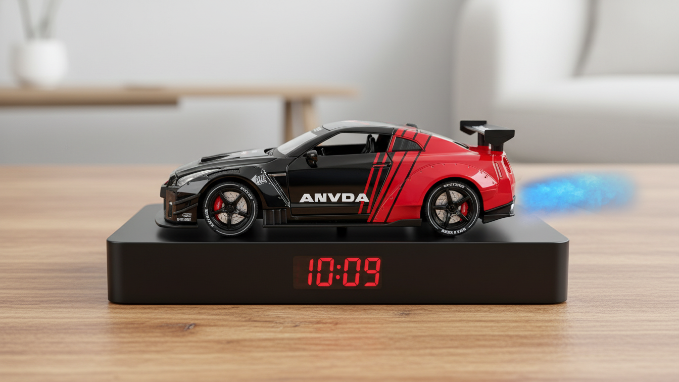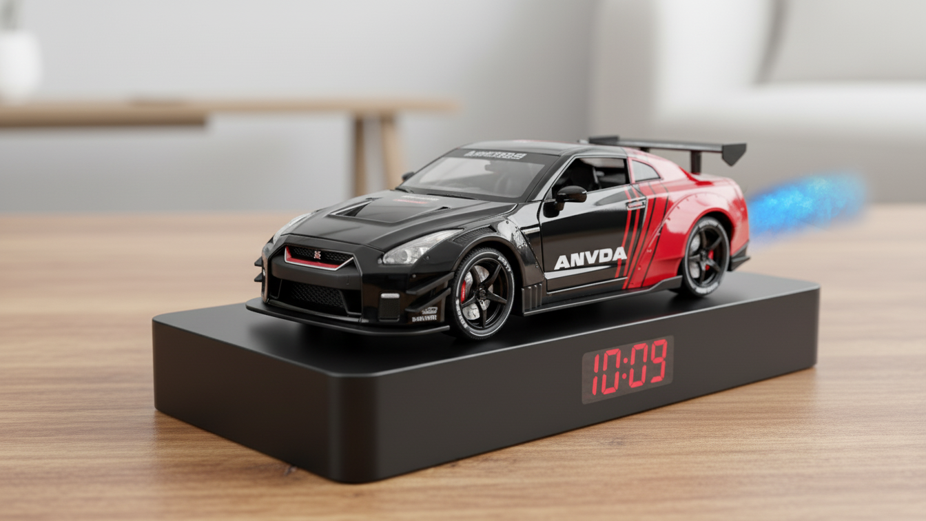 This Nissan GT-R alarm clock is built using a 1:24 scale Nissan GT-R collectible model, mounted on a minimalist black platform with an integrated red digital time display. It combines legendary GT-R performance styling with practical alarm clock functionality, making it both a display-worthy collectible and a fully functional desk or bedside clock.