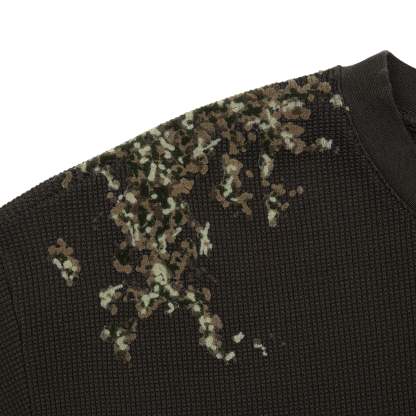 320gsm waffle fabric / 97% preshrunk cotton 3% elastane / embroidered on the neck / flock print on front, shoulder and sleeve / slightly distressed on collar rib, cuffs and hem / fits true to size