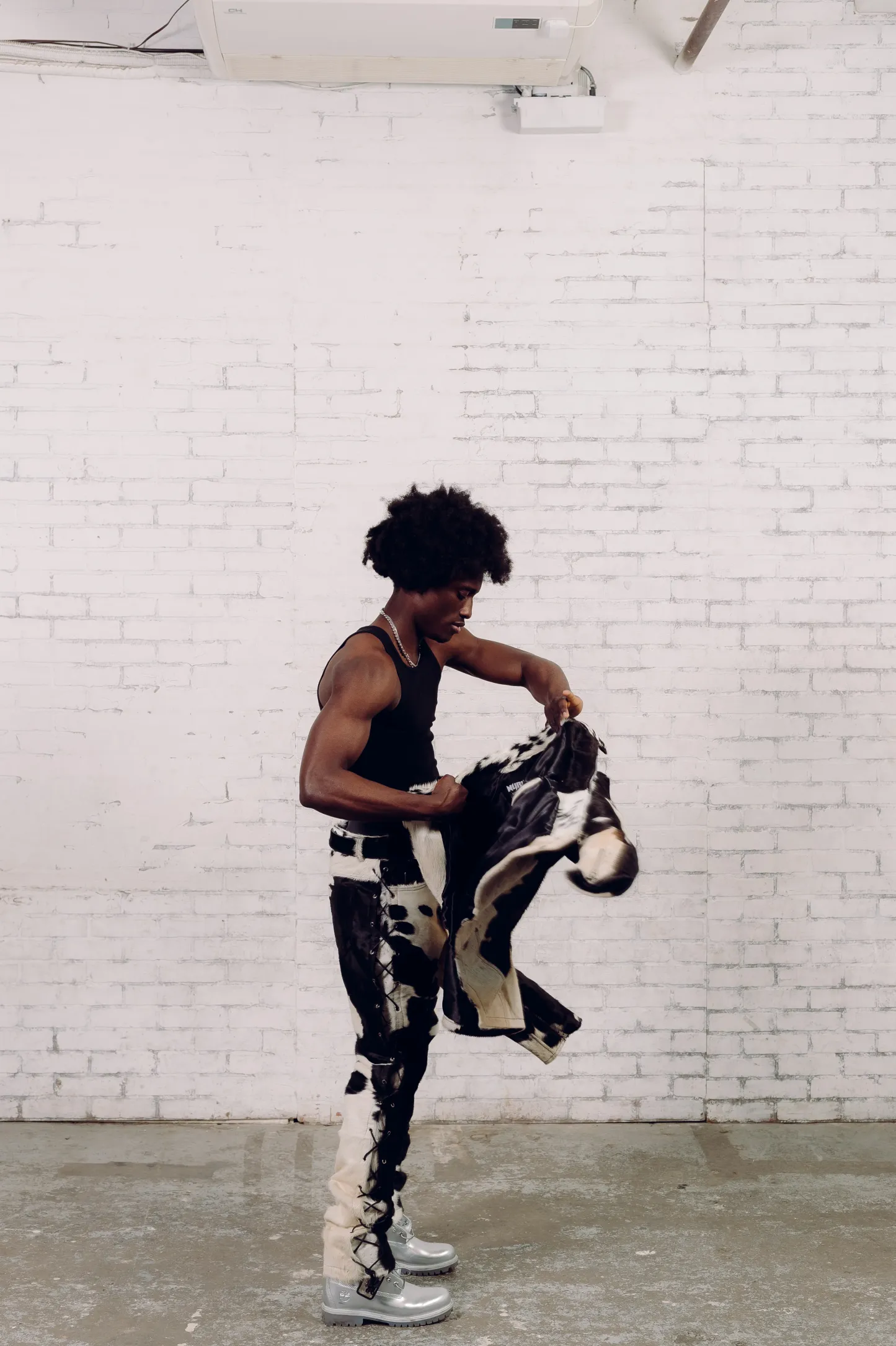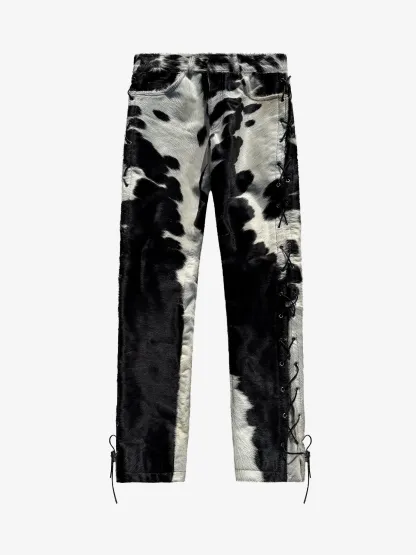featuring a straight-leg silhouette with hand-laced side detailing, ensuring each piece is uniquely one-of-a-kind.