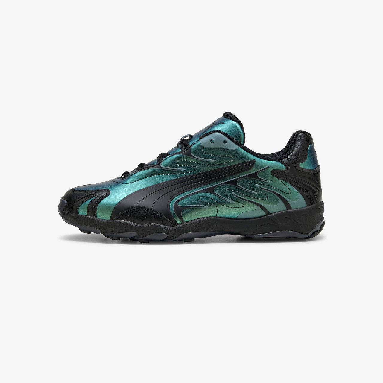 Originally launched in 2000 as a running shoe with bold, exaggerated contours and a thick sole, the PUMA Inhale continues to grow and evolve with this brand-new cutting-edge Color Shifting iteration. Built with its extreme curves and aggressive DNA still intact, the PUMA Inhale Color Shifting is crafted with eye-catching iridescent and leather fabrics, complemented by the signature wavy contoured lines and distinct PUMA formstrip on the sidewall, while classic PUMA logos on the tongue label and heel counter round off the design.