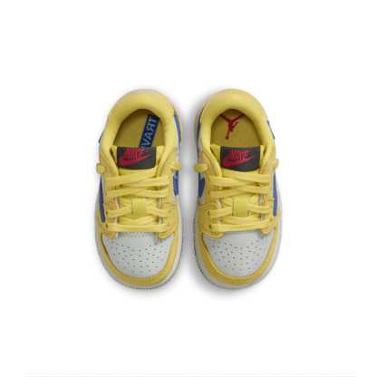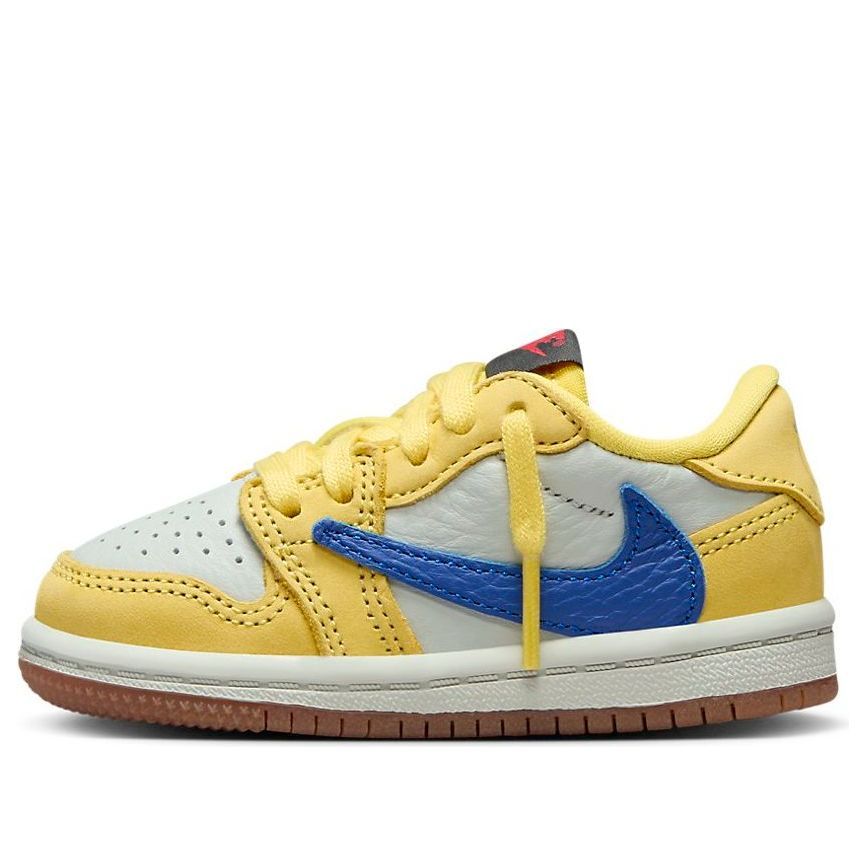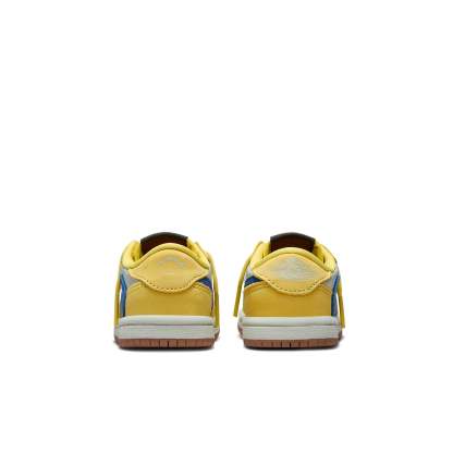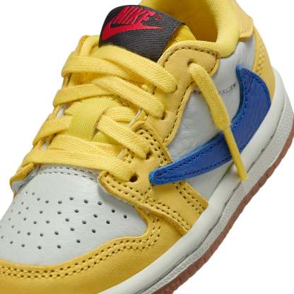 The Toddler Travis Scott x Air Jordan 1 Retro Low OG SP 'Canary' is a limited-edition sneaker designed by Travis Scott and Jordan Brand. This premium shoe features a bright canary yellow upper with a reverse Swoosh and a gum outsole. The toddler-sized sneaker is perfect for young sneakerheads who want to step out in style.