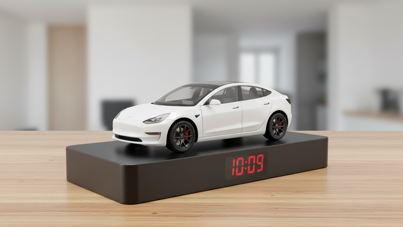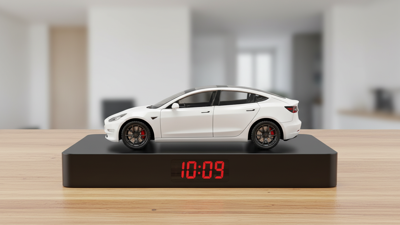 Designed for electric car enthusiasts and modern interior lovers, this alarm clock combines clean automotive design with practical everyday functionality.