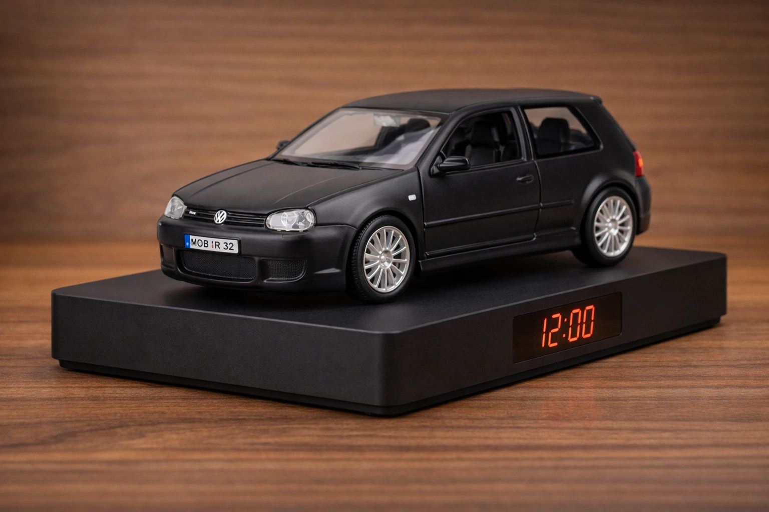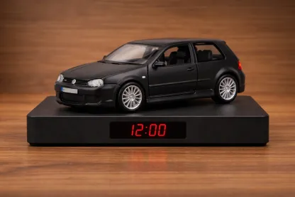 This model car alarm clock is built using a 1:24 scale VW Golf R32 collectible model, mounted on a minimalist black platform with an integrated red digital time display. It combines authentic automotive design with everyday functionality, creating a product that feels both nostalgic and modern.