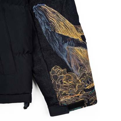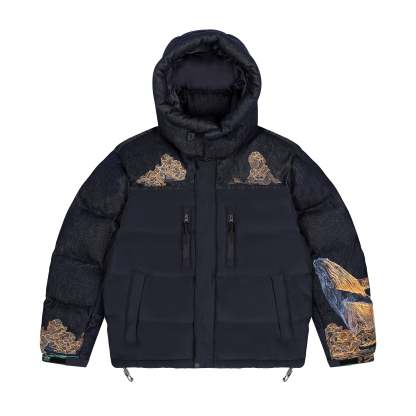 100% polyester water repellent fabric / 10oz denim / micro gel filling / embroidery on front-back yokes and sleeves / removable hood / adjustable waistband / fits true to size