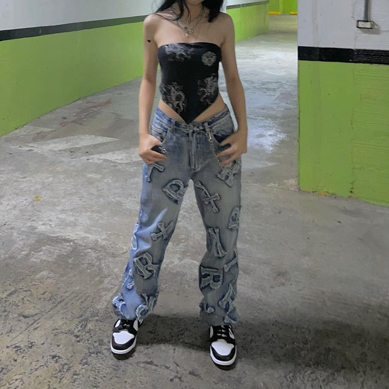 Y2K Star Embroidered Baggy Denim Jeans