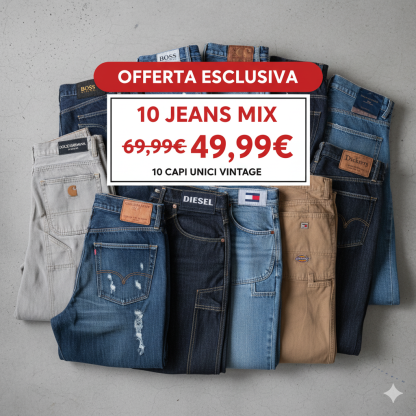 Vendiamo jeans di marca usati, accuratamente selezionati per offrirti solo capi di alta qualità, senza difetti. Ogni box contiene 10 pezzi di jeans firmati vintage, perfetti per chi ama lo stile unico e retrò, al prezzo imbattibile di 49,99€ per box.