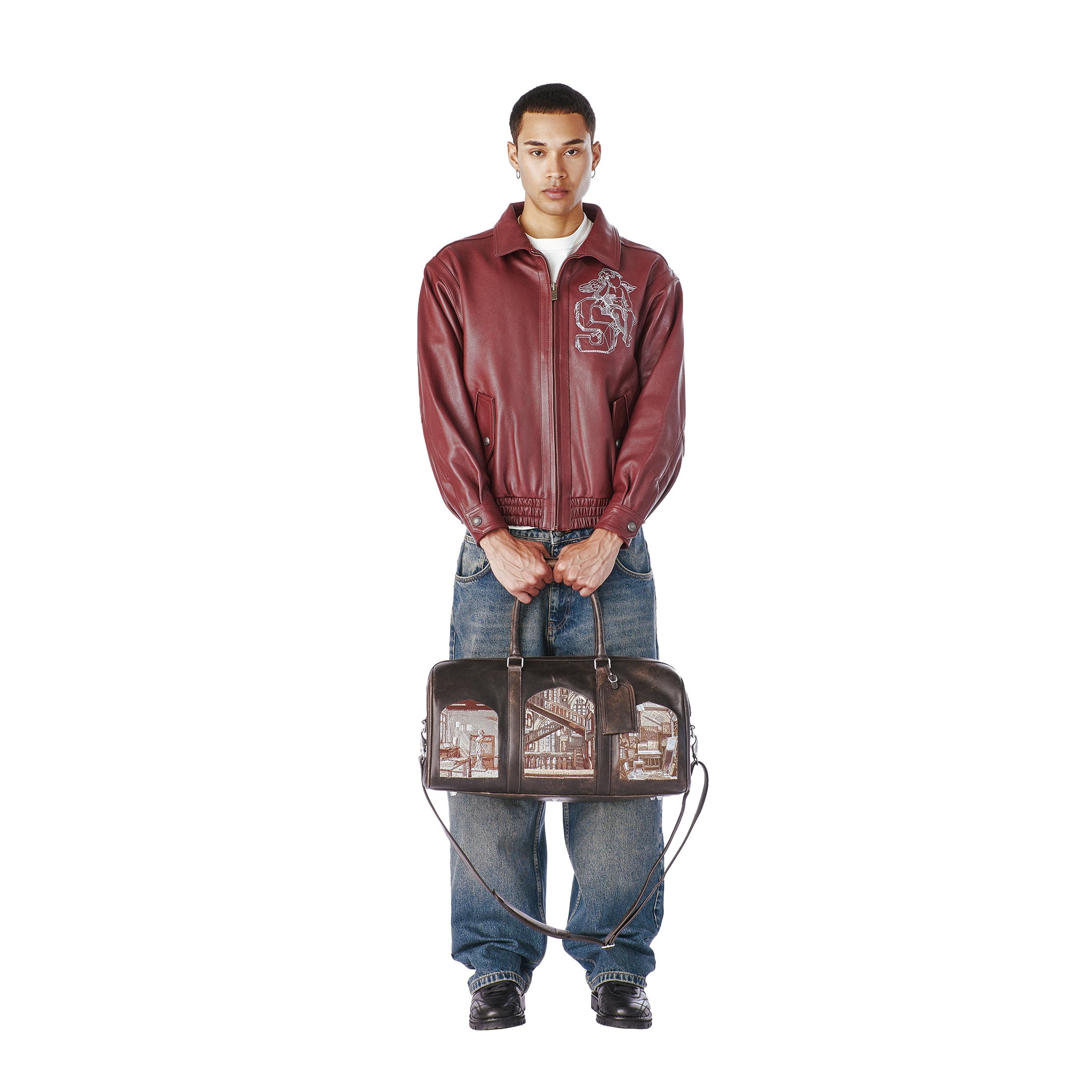 genuine leather / fully embroidered design on both sides / measurements 50x32x22cm