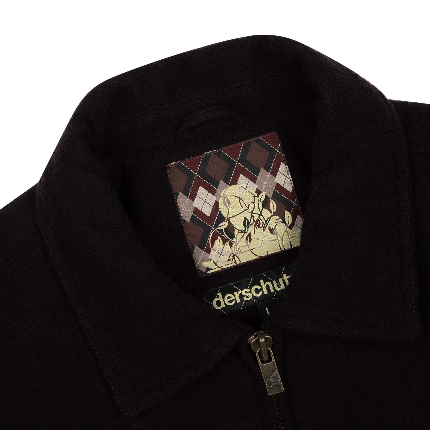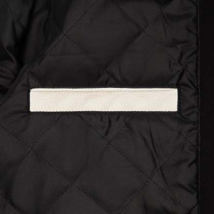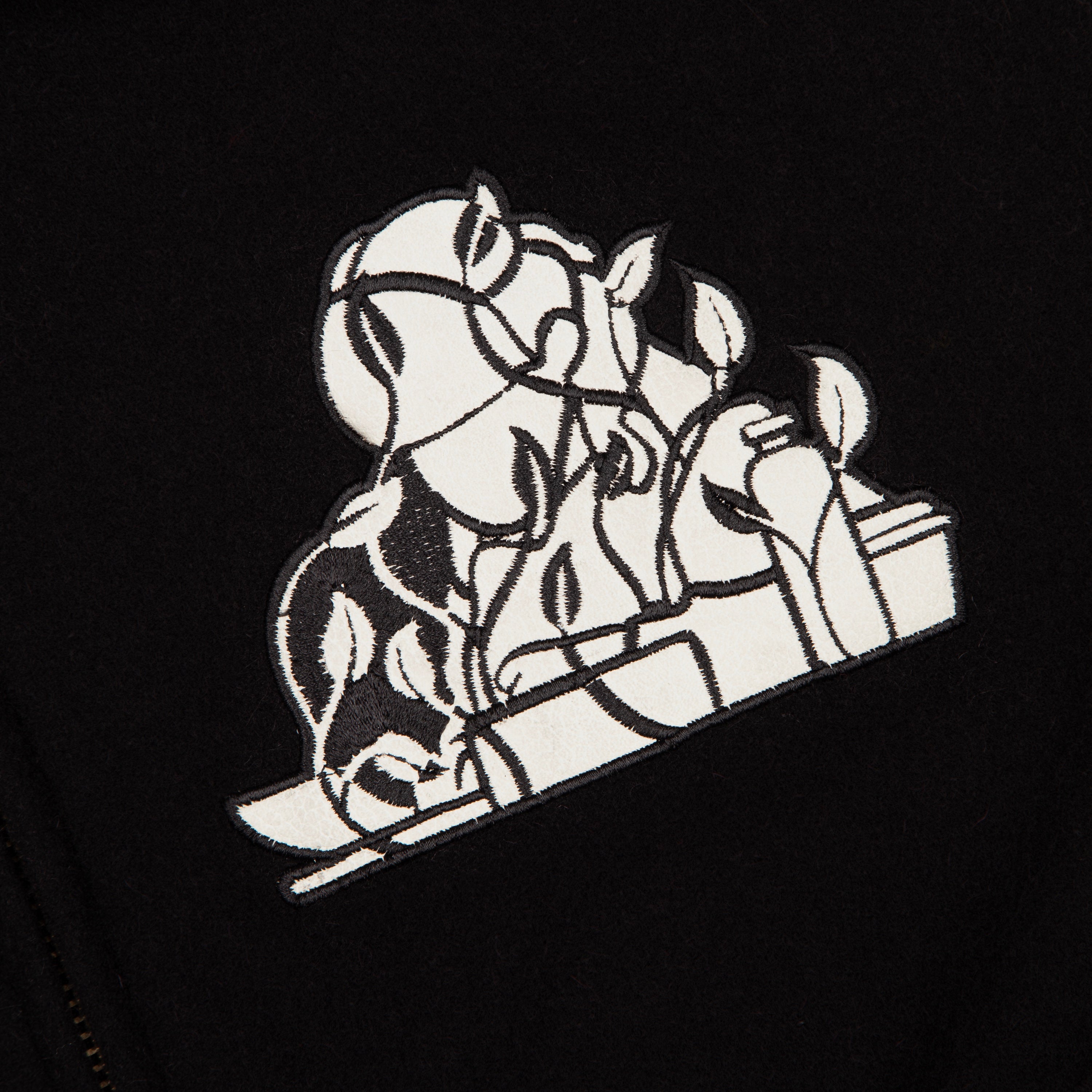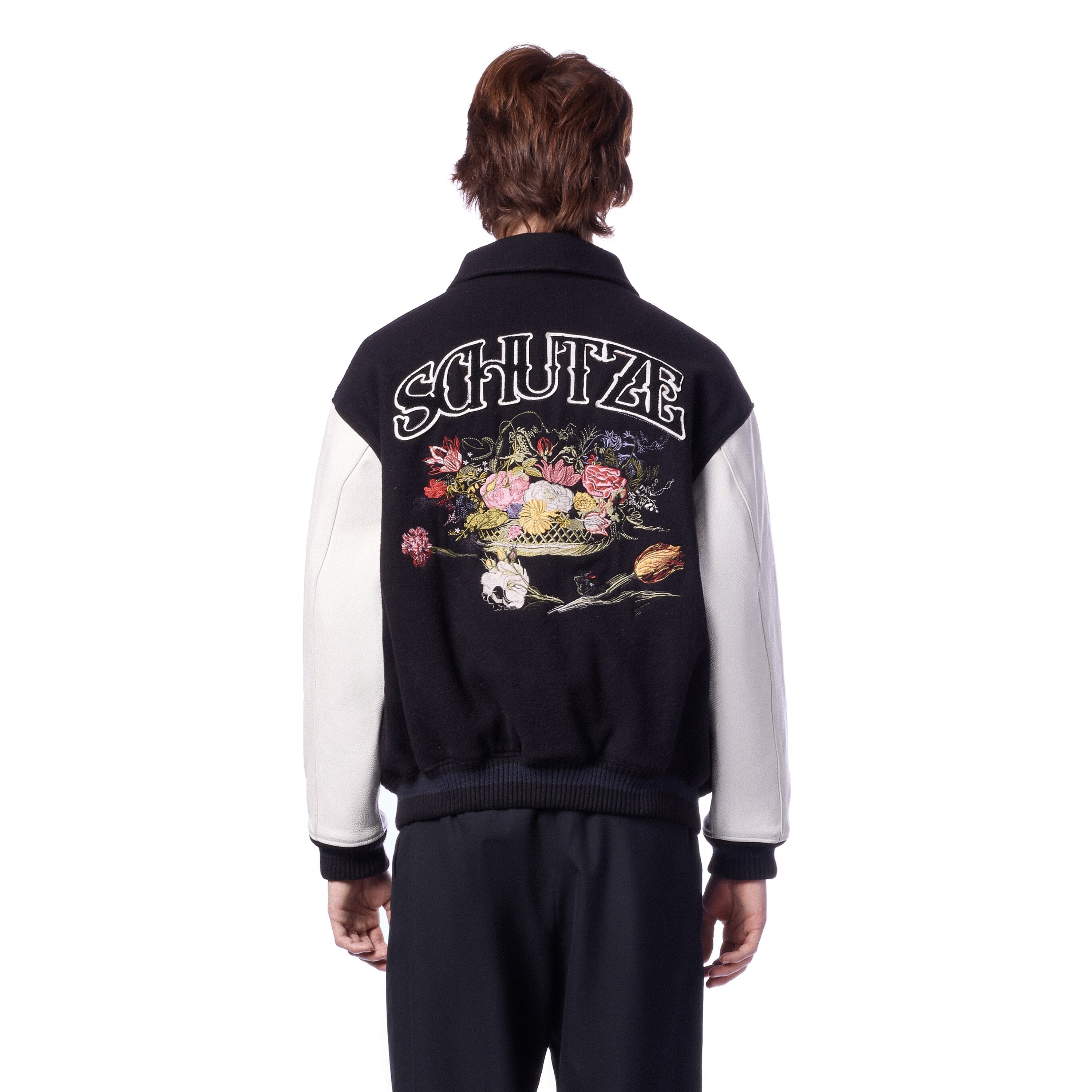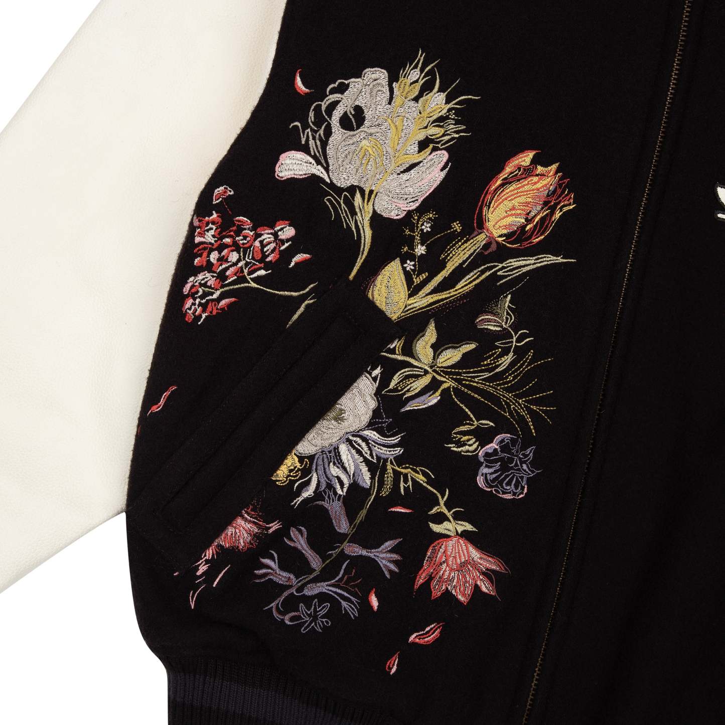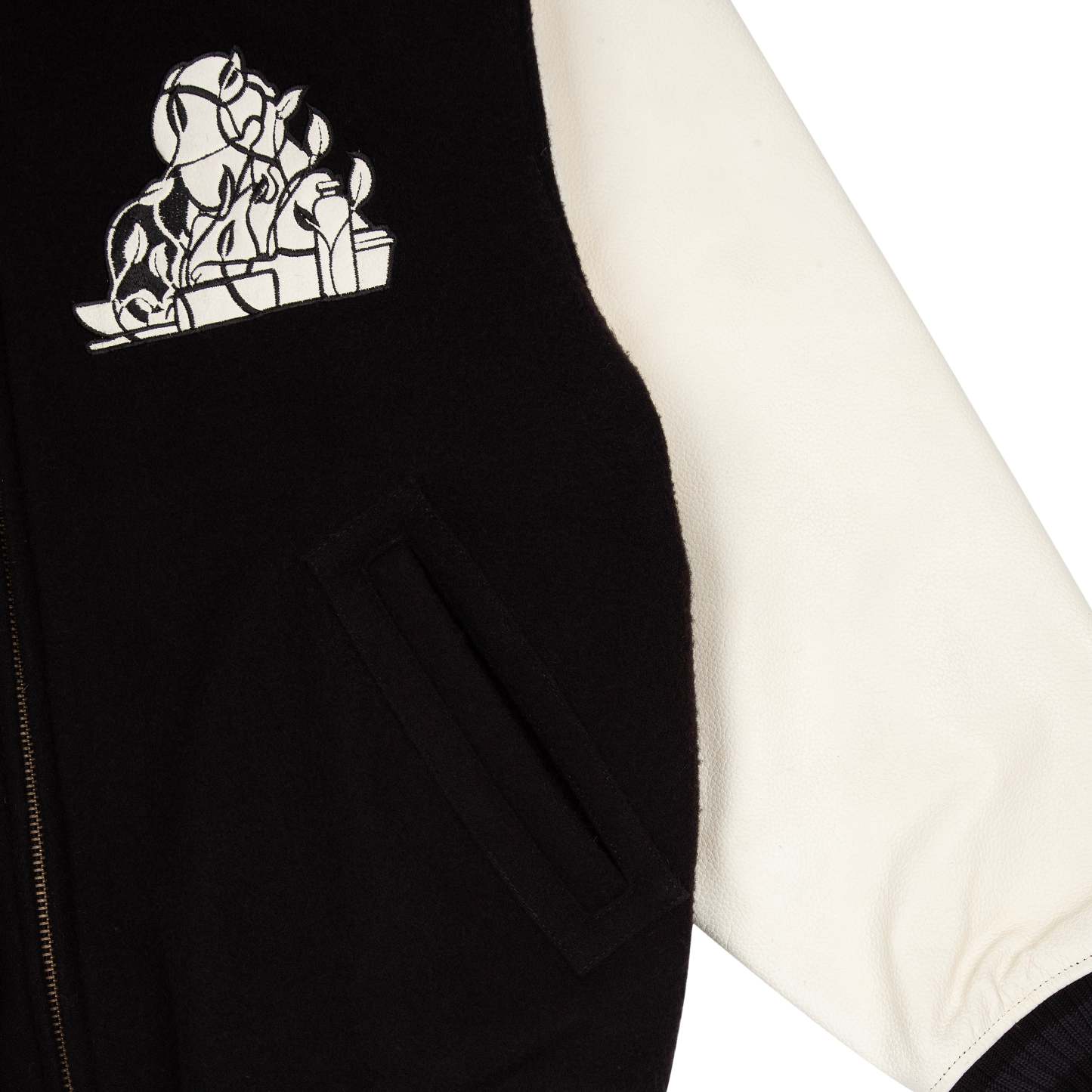 wool fabric / 100% plain leather sleeves / polyester lining / ribbed hem and cuffs / embroidery on front and back / leather appliqué embroidery on front chest / with YKK zipper / fits true to size