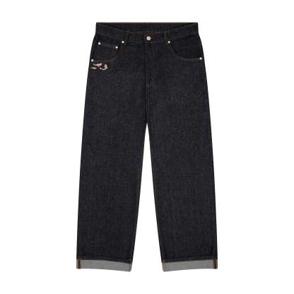 14,5oz denim / selvedge denim feel / 100% cotton / embroidery on front and back pocket / embroidered leather patch / baggy fit