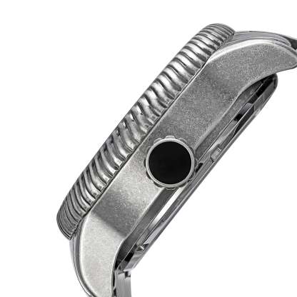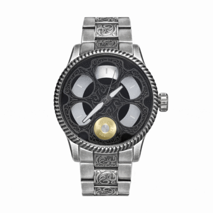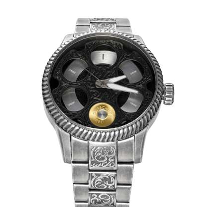 solid stainless steel with a brushed gunmetal finish and engraved pattern on bracelet and dial / JAPANESE MIYOTA 8215 automatic movement / rotating unique revolver cylinder motif with 6 chambers and a golden bullet-style detail / luminous effect / up to 10 ATM (waterproof) / approx. 43mm