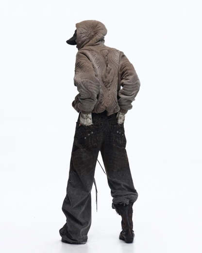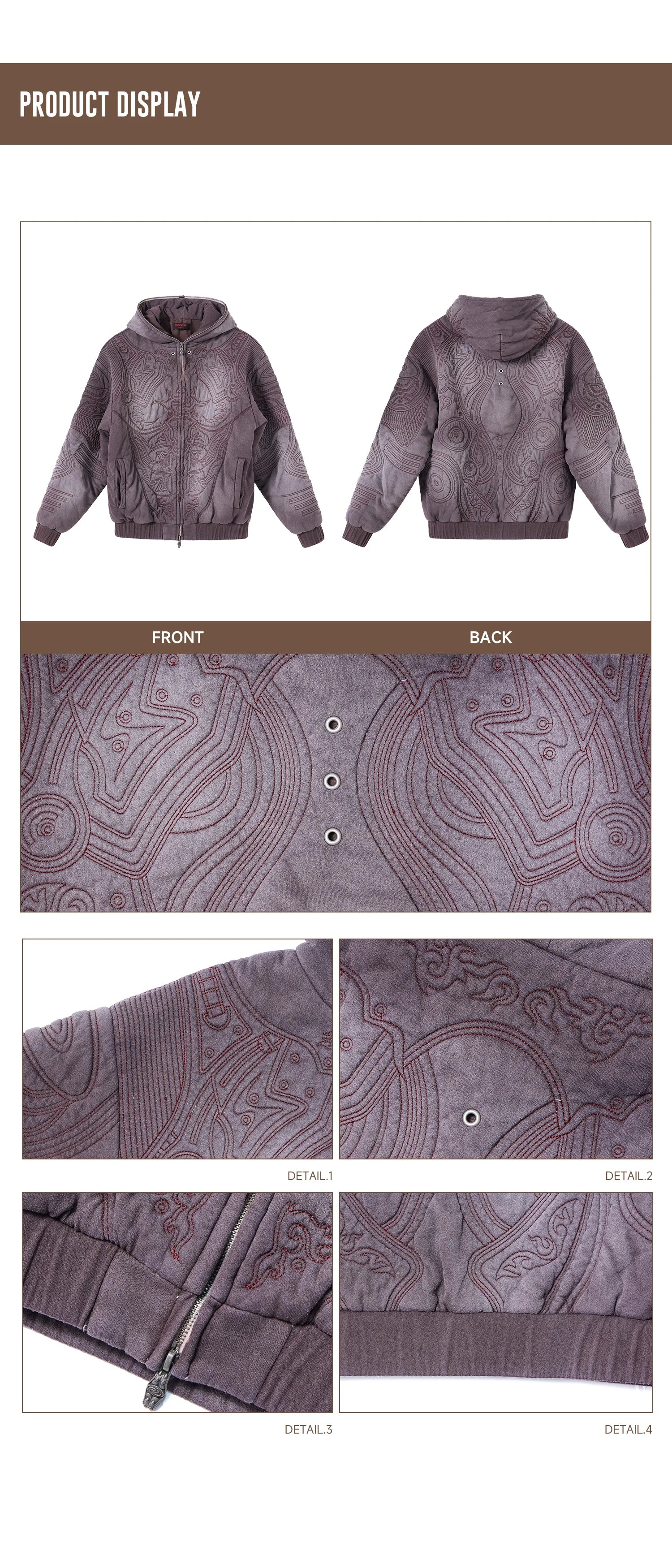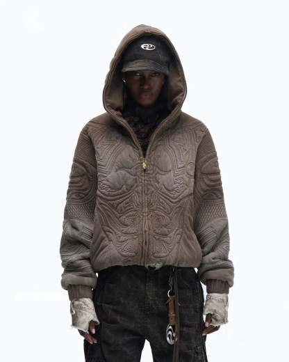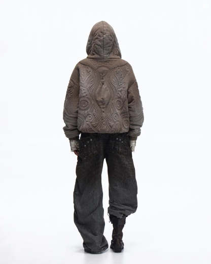 PL Textured Full-Zip Hoodie with Chinese Motif Embroidery In Brown