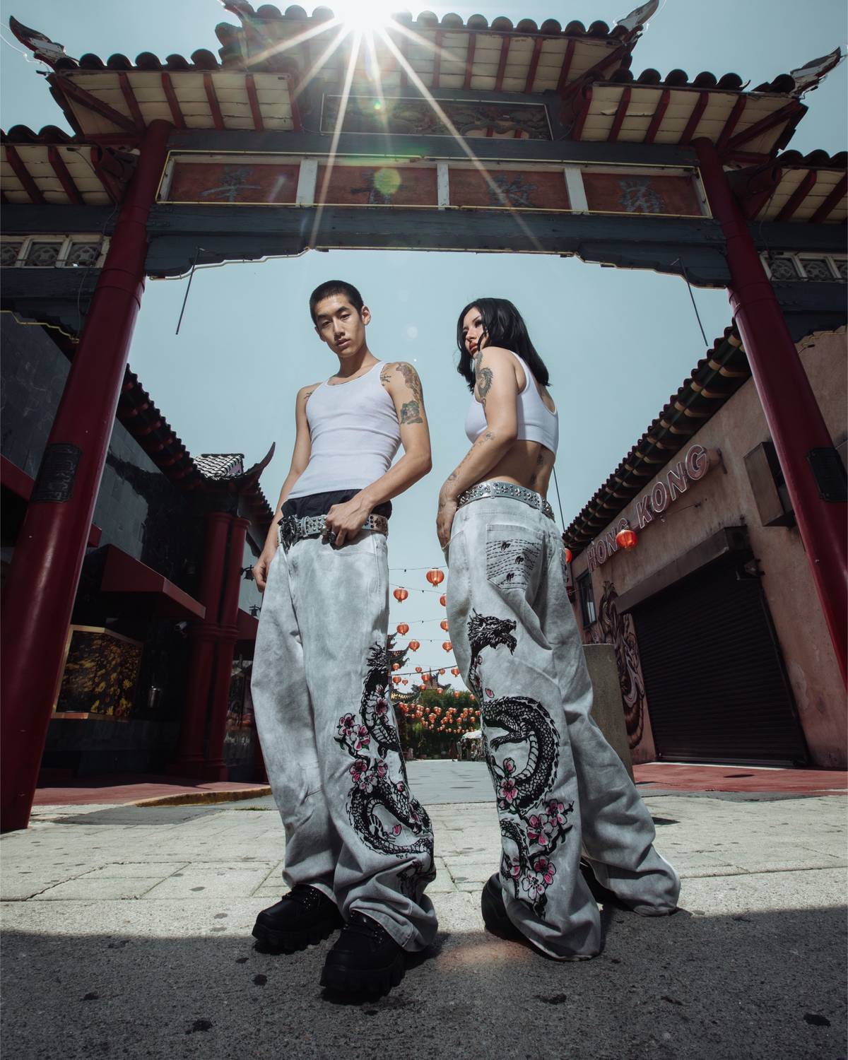 Unleash bold energy with our Dragon Embroidery Denim �� where East Asian artistry meets modern streetwear. These light-wash baggy jeans feature an intricate black dragon winding down the leg, brought to life with pops of pink cherry blossoms and traditional script-style accents.