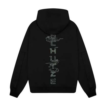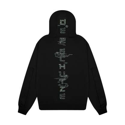 480gsm french terry/ 100% preshrunk cotton/ embroidery on back and hood/ quilt on sleeves / fits true to size