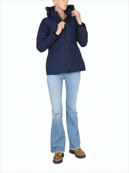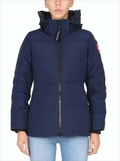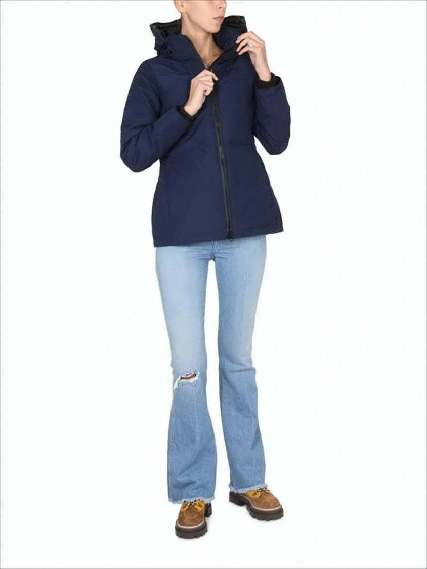 This exquisite padded down coat from Canada Goose showcases a structured silhouette complemented by horizontal quilting. A high collar and hood provide warmth, while the front zipper closure and side pockets enhance functionality. Fitted at the waist and featuring long sleeves, this coat epitomizes modern elegance in cold-weather apparel.