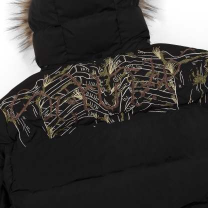 water repellent fabric / 100% polyester / micro gel filling / embroidery on sleeves, front and back / removable hood / adjustable waistband / fits true to size