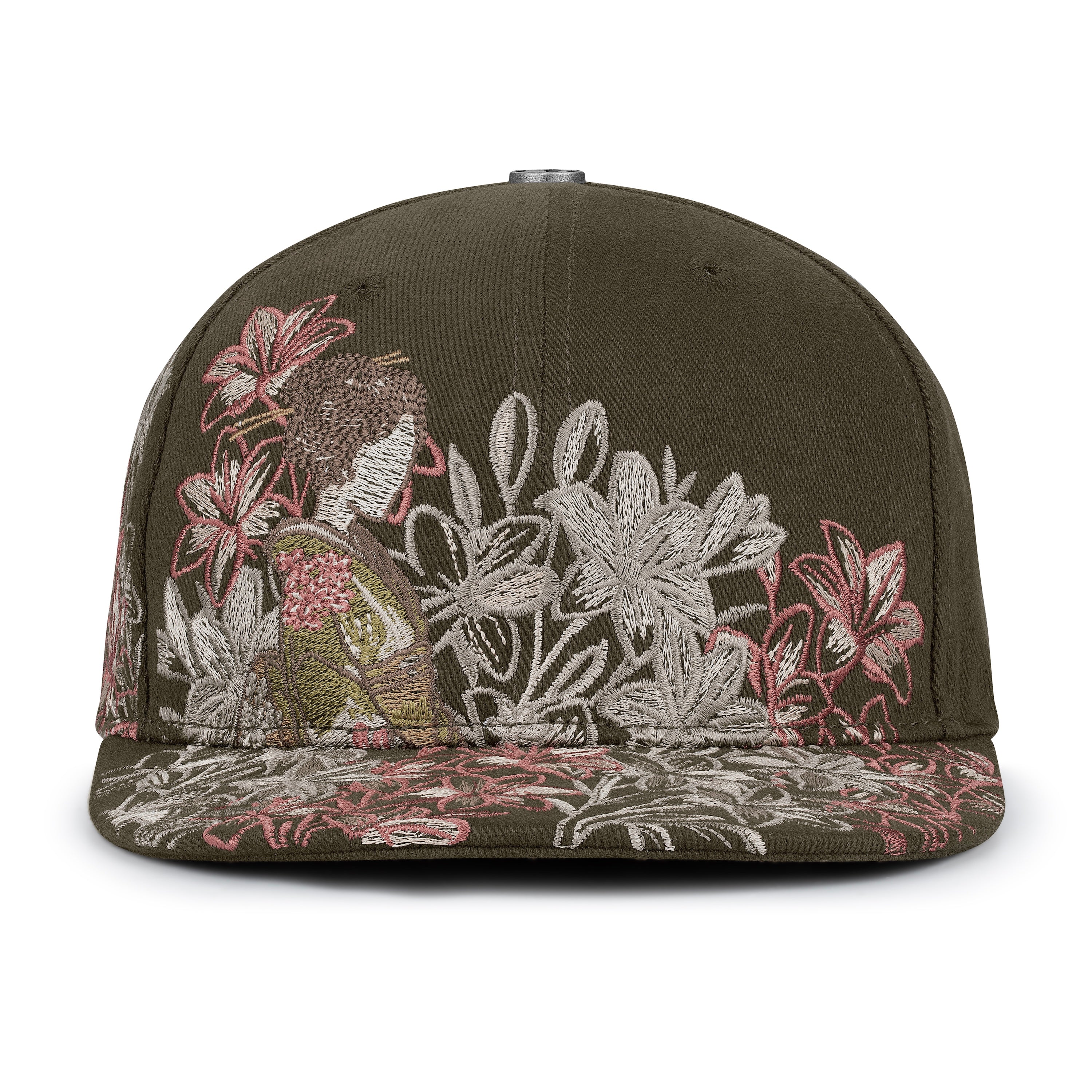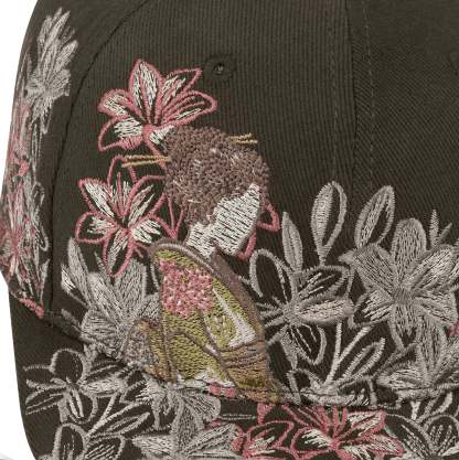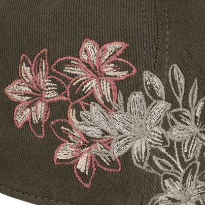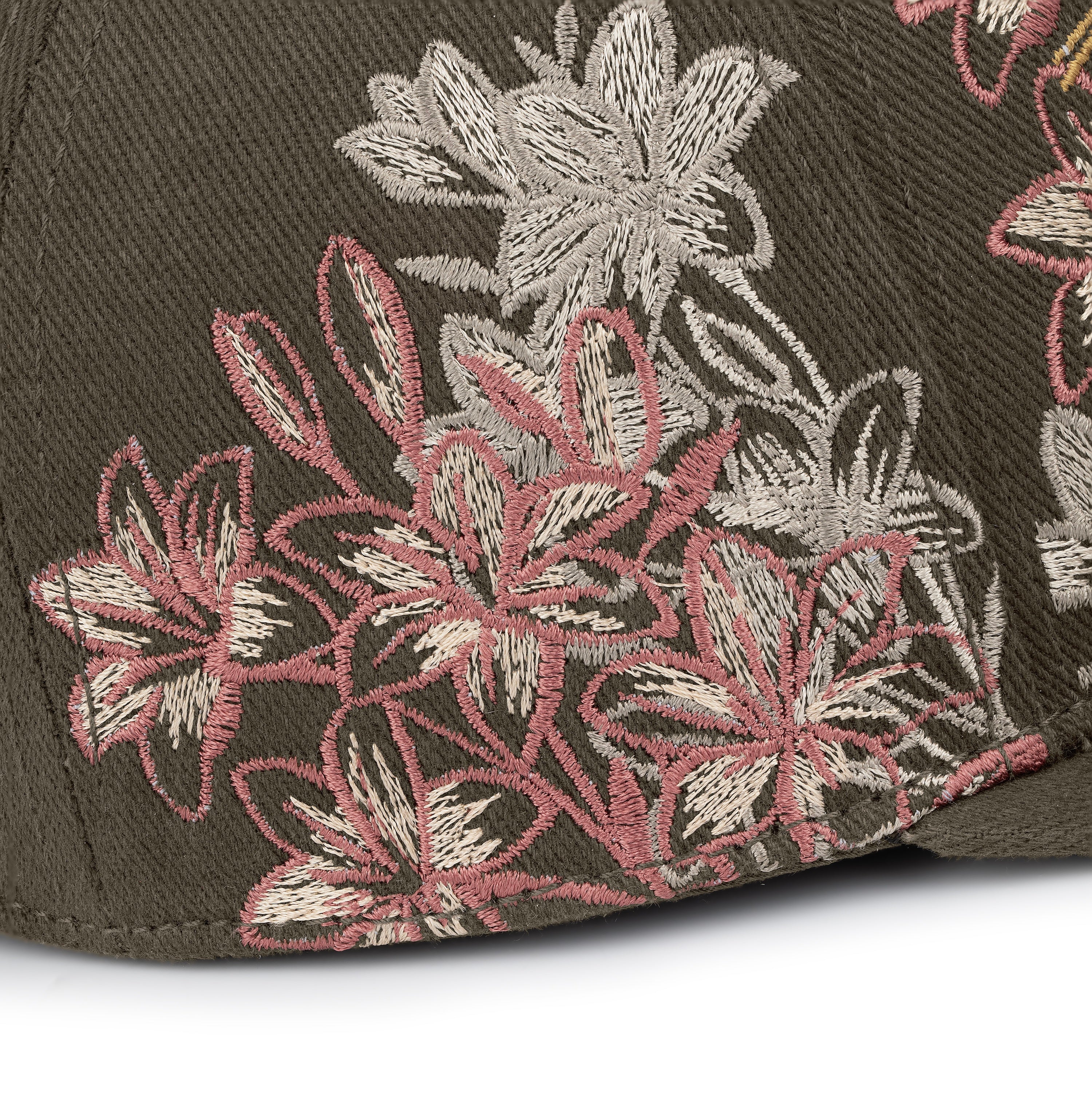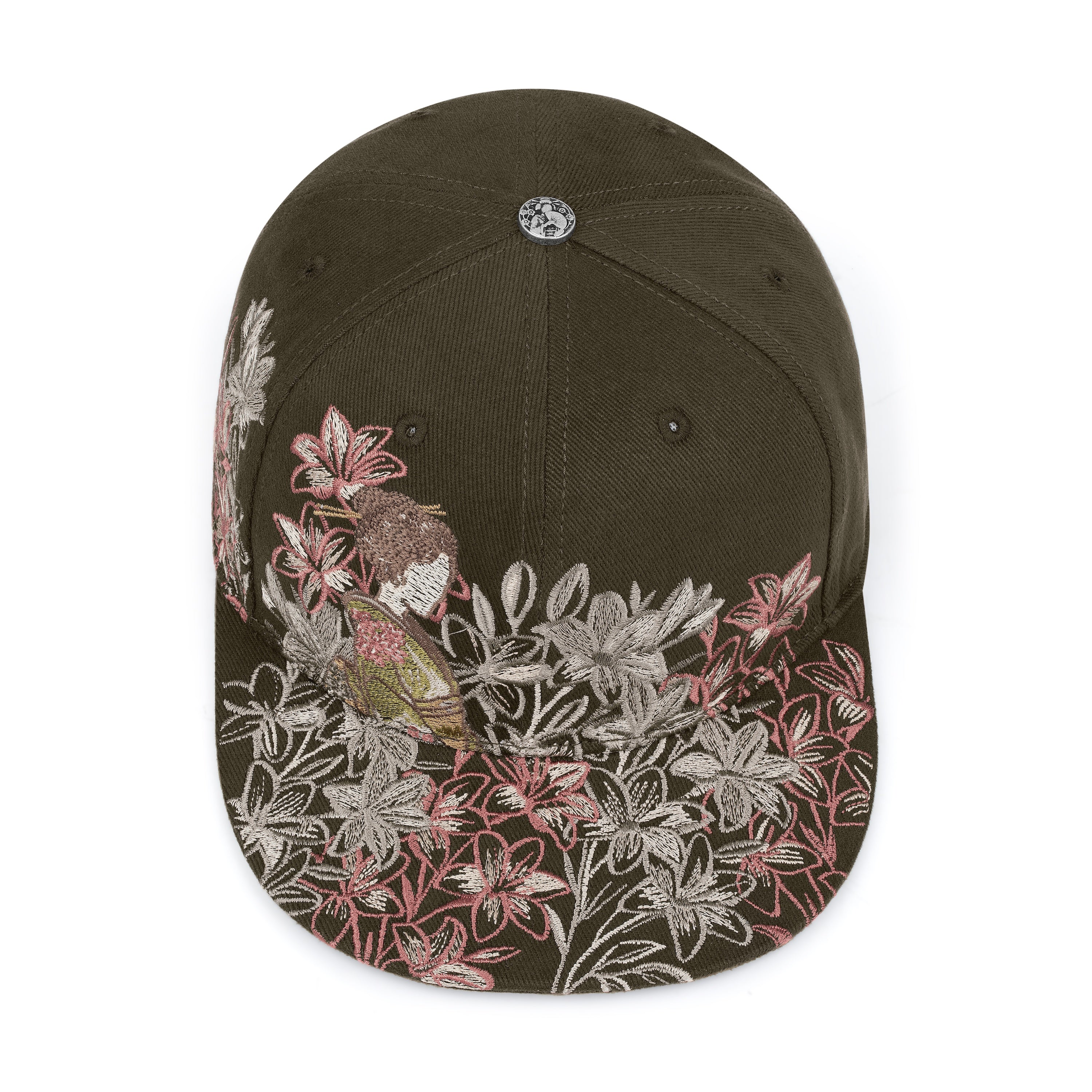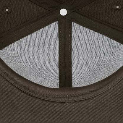 gabardine fabric / embroidery on front, back panels and visor / custom button on top