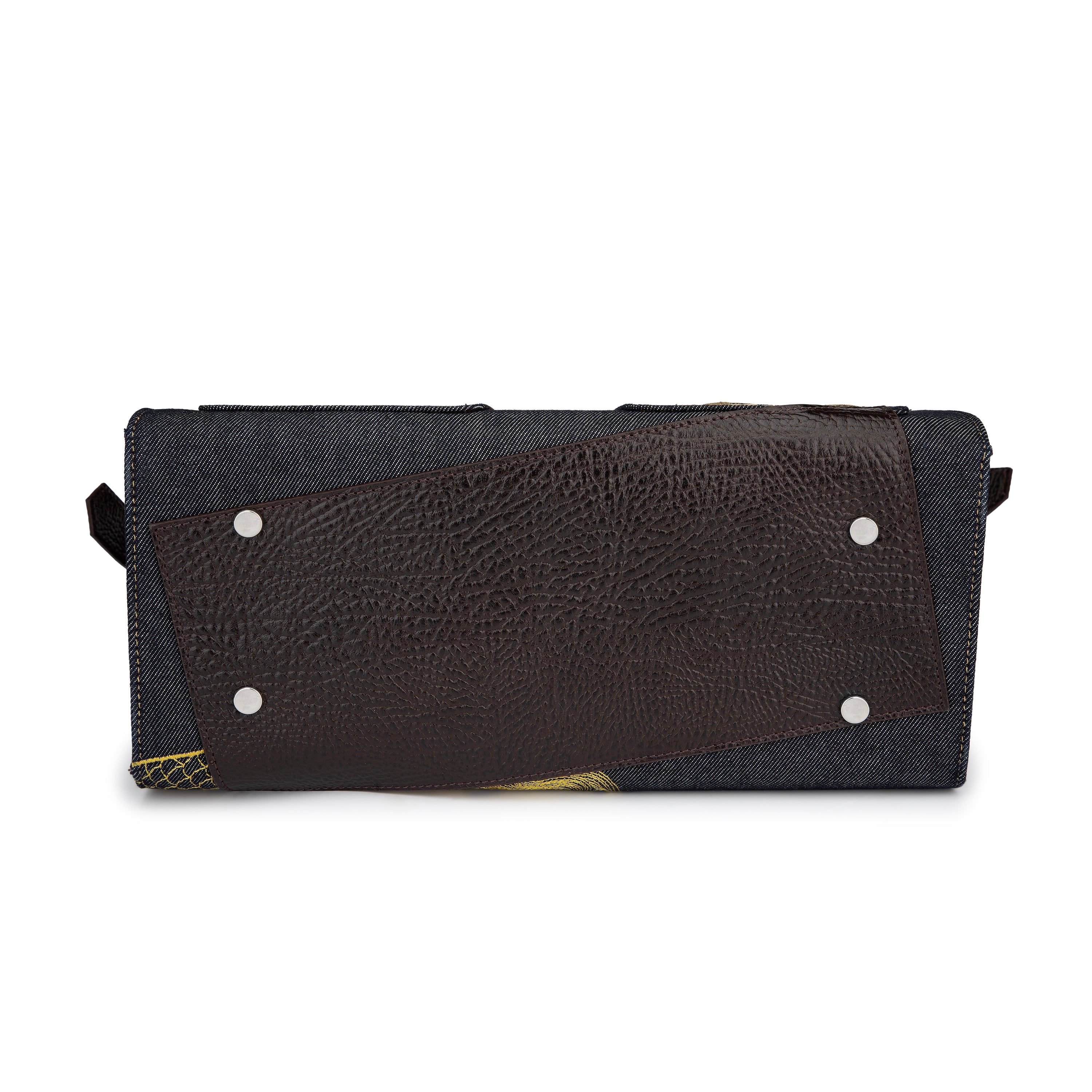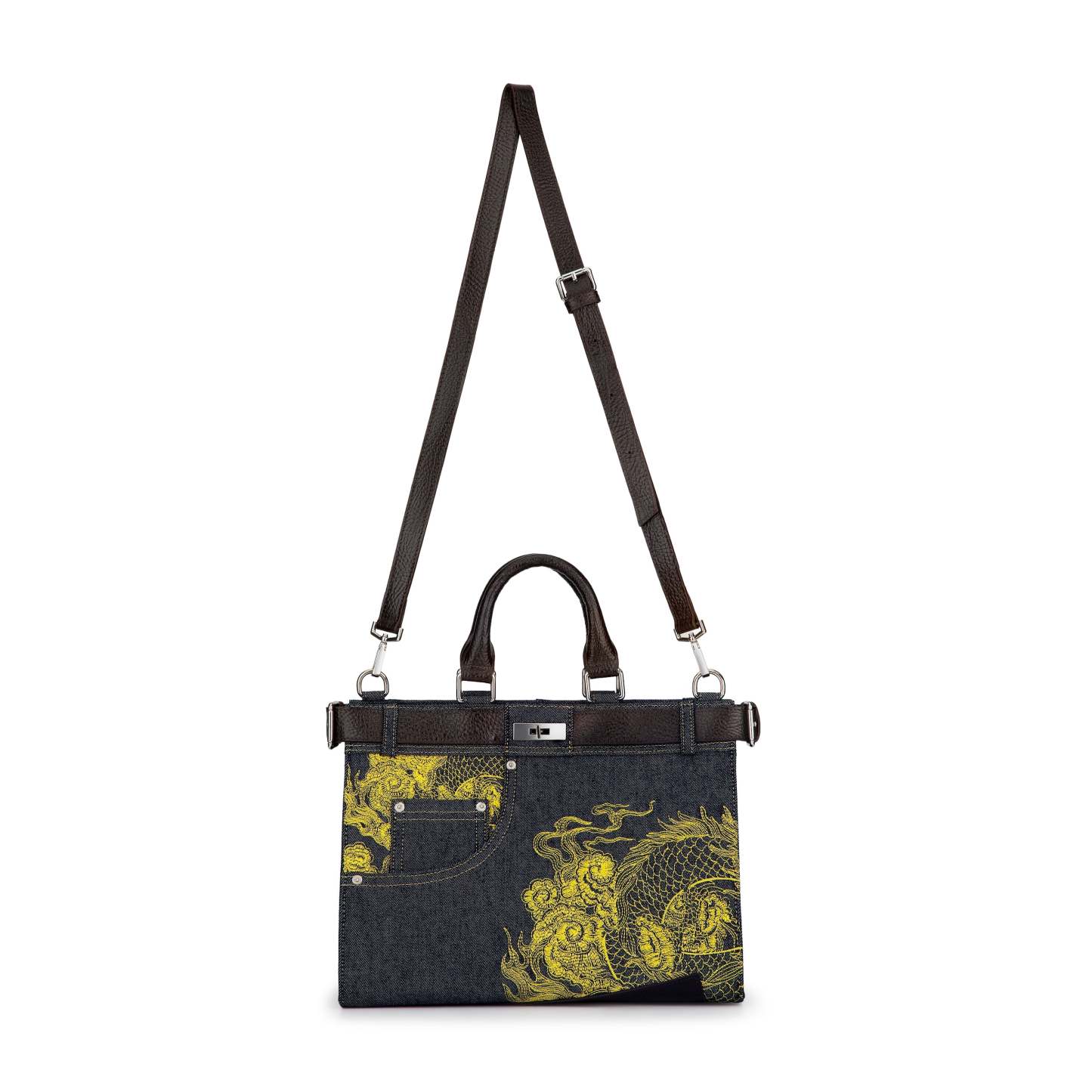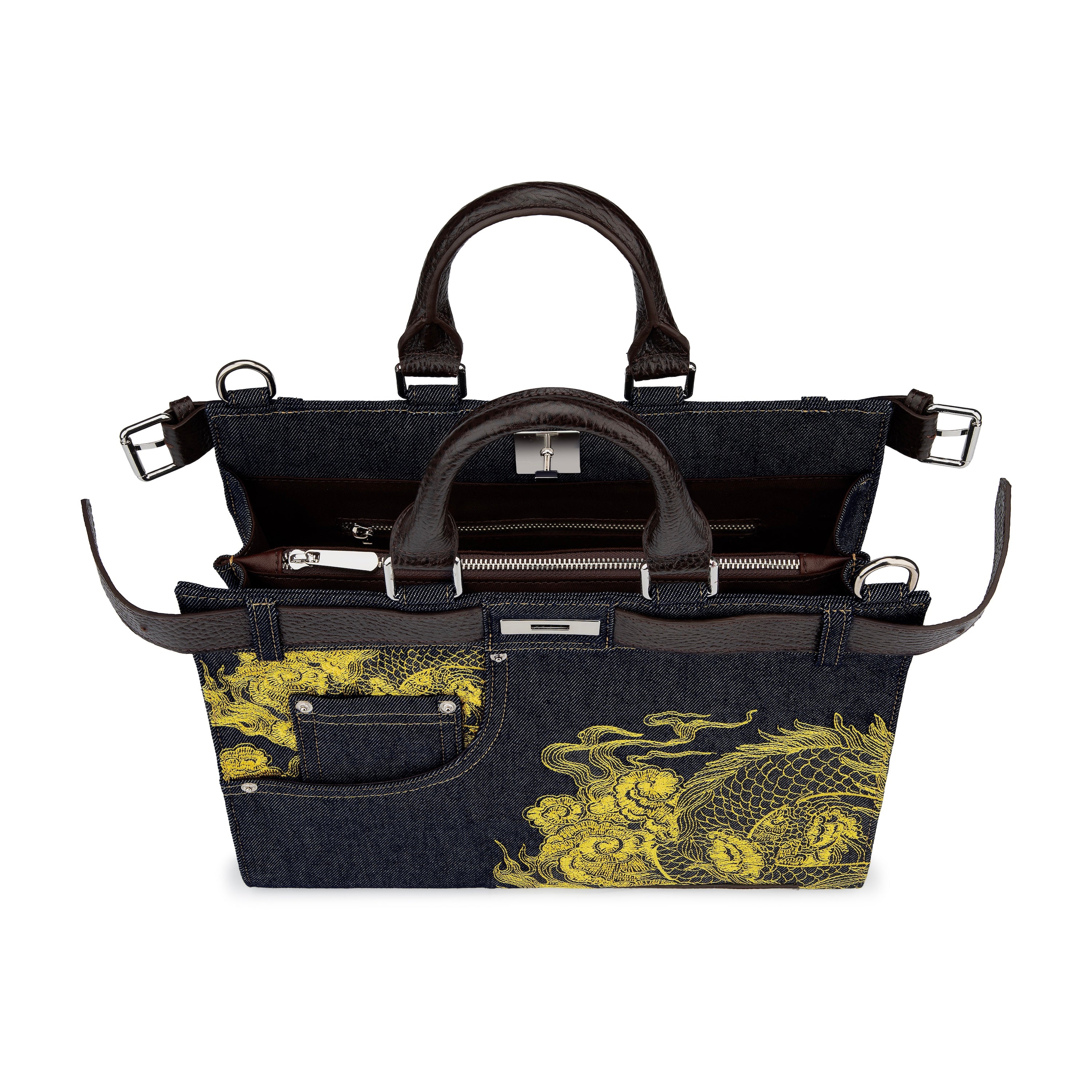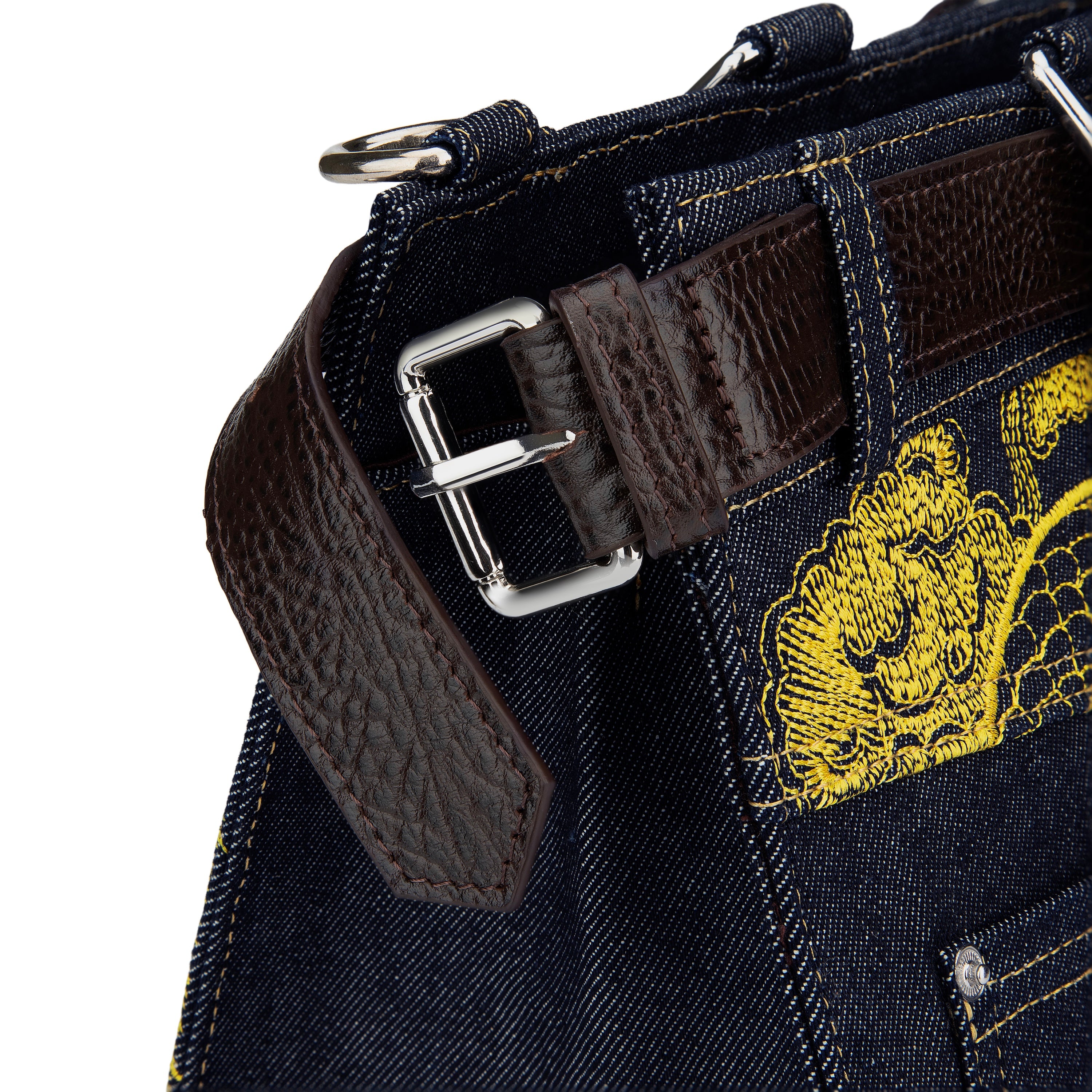 indigo raw denim / genuine leather handle and adjustable leather strap / genuine leather belt detail is functional and can be opened at both ends / with turn-lock closure / denim pocket details on front and back / embroidery on front and back / two inner compartments divided by a zip pocket / with inner pocket with zip